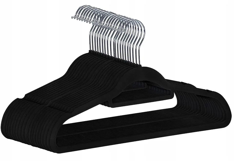 Wieszak welurowy Maxi komplet 60 sztuk czarnyKolor: czarny Praktyczne wieszaki z miękkim weluremPolecamy welurowe wieszaki ubraniowe doskonałe do szafy, garderoby. Pomogą wyeksponować odzież a także zapobiegną jej gnieceniu.Wieszaki są wykonane z plastiku i w całości pokryte przyjemnym w dotyku welurem, dzięki czemu ubrania nie zsuwają się.Mocny, metalowy haczyk umożliwia łatwe i wygodne zawieszanie wieszaka i utrzyma cały strój. Specyfikacja:Kolor: czarnyMateriał: tworzywo sztuczne, welur, stalObrotowy haczyk 360°: takMax. obciążenie: 5 kgWymiary:Szerokość: 44,5 cmGłębokość: 0,5 cmWysokość: 24,5 cmWymiary haka: 8 x 5,4 cm Oszczędność miejsca w Twojej szafieWieszaki welurowe dzięki swojej konstrukcji zaoszczędzą sporo miejsca w Twojej garderobie czy szafie. Są cienkie i bardzo wytrzymałe. Dzięki nim zorganizujesz więcej miejsca na odzież.Praktyczne i wytrzymałeWieszaki welurowe są bardzo wytrzymałe a przy tym cienkie. Ciężko je złamać. Mają wyprofilowany kształt, dzięki czemu ubrania się nie odkształcają. Pokrycie welurem gwarantuje niezsuwanie się ubrań i niepowstawanie zagnieceń. W pełni obrotowe chromowane haczyki zwiększają komfort użytkowania. Uchwyt na podwieszanie krawata / paska Wcięcia na podwieszenie topuUWAGA | Przedstawione kolory należy traktować poglądowo - mogą odbiegać od rzeczywistych ze względu na różne ustawienia monitorów oraz proces obróbki zdjęć. Rzeczywiste wymiary mogą się różnić od podanych w opisie. Tolerancja błędów może wynosić +/- 5 %