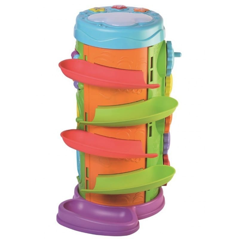 WIEŻA NIESPODZIANKA 5W1 Wysoka wieża skrywa wiele sensorycznych skarbów! Na każdej ze stron znajduje się tu inna zabawa, która pozwoli dziecku ćwiczyć motorykę małą, poznawać zależności przyczynowo - skutkowe i rozwijać zdolności poznawcze. Wśród kolorowych ścianek zabawki pochowało się 5 różnych zabaw: zjeżdżalnia z piłeczkami, trybiki do kręcenia, sorter kształtów z klockami do dopasowania, ruchome elementy do przesuwania i obracania, a także, na samej górze, urocza chmurka z przyciskami aktywującymi melodie i kolorowe, świetlne wzorki. Cechy produktu: - 5 aktywności: słuchaj, obserwuj, kręć, dopasowuj, przesuwaj; - 5 stron zabawy: światełka i muzyka, zjeżdżalnia z piłeczkami, trybiki, sorter kształtów, koraliki; - światełko (świecące wzory na chmurce); - wesołe melodie; - rozmiar po złożeniu: 24 cm (szerokość) x 28 cm (głębokość) x 40 cm (wysokość); Baterie: 2 x AAA (zawarte w zestawie); Wiek: 18m+