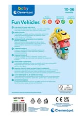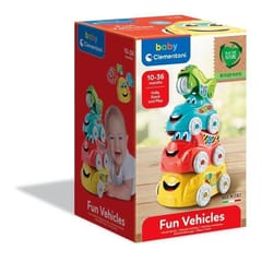 Samochodziki są w żywych kolorach, ozdobione śmiejącą się buzią.