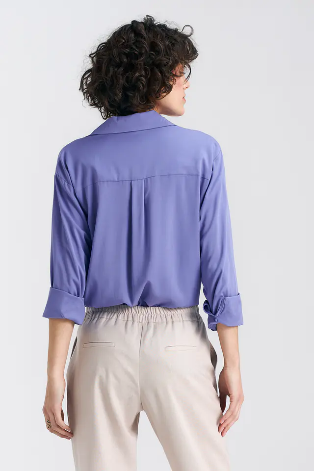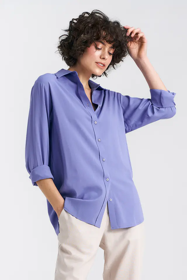Krój oversize. Materiał wiskoza. Kolor fioletowy - veri peri. Klasyczny kołnierzyk. Długi rękaw zakończony mankietem. Zapięcie na guziki z przodu. Na plecach karczek z zakładką pośrodku. Skład: 100% wiskoza Modelka na zdjęciu ma 176 cm wzrostu i ma sobie rozmiar 36.