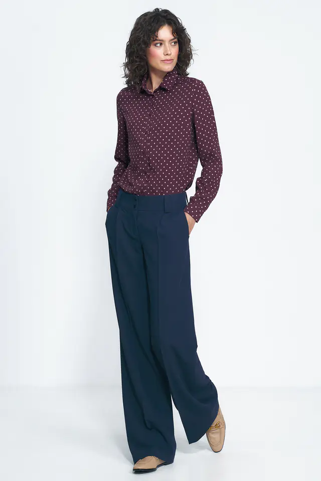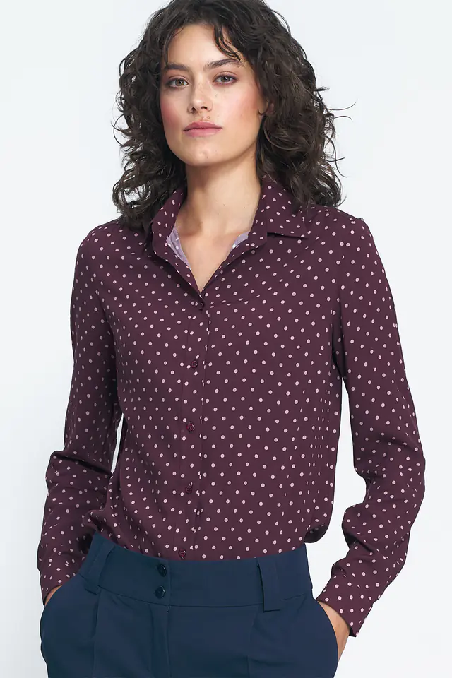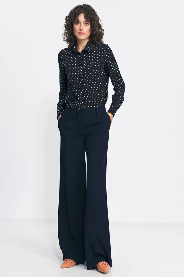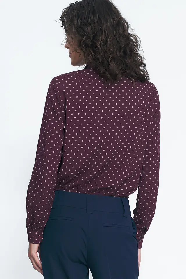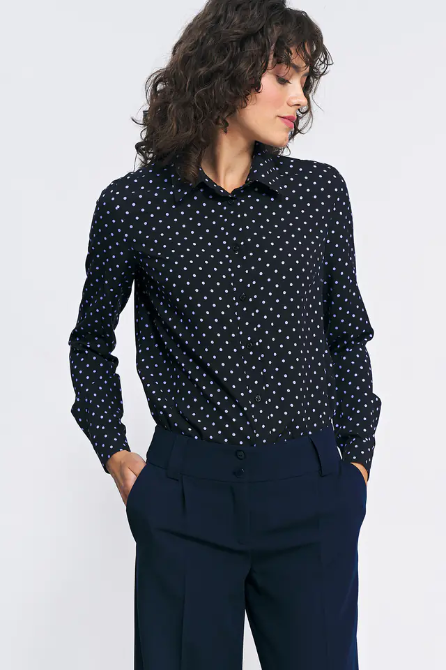 Wiskozowa koszula w groszki z delikatnym kołnierzykiem i długim rękawem - to must have tej jesieni! Połączenie czerni i białych groszków świetnie prezentuje się zarówno z klasyczną, jak i z bardziej wyrazistą stylizacją. Koszula dobrze prezentuje się solo, a także pod miękkim kardiganem lub pod marynarką. Skład: 100% wiskoza. Modelka na zdjęciu ma 176 cm wzrostu i ma sobie rozmiar 36.