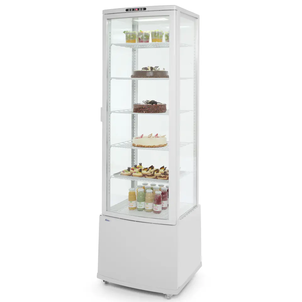 Numer producenta: Hendi 233696Witryna chłodnicza nastawna w kolorze białym to urządzenie zaprojektowane z myślą o cukierniach, piekarniach, kawiarniach czy barach sałatkowych lub kanapkowych. Ułatwia ekspozycje żywności przy jednoczesnym zachowaniu odpowiedniej dla niego temperatury.Cechy produktu:– podwójnie przeszklona z łatwo otwieranymi giętymi drzwiami skrzydłowymi– kanał powietrzny na zewnątrz szkła w celu usunięcia i zapobiegania kondensacji pary wodnej– obudowa z malowanej stali nierdzewnej– oświetlenie wewnętrzne na górze komory– 5 przestawnych stalowych półek, powlekanych PVC na biało– zakres temperatur: 2 do 8˚CParametry:– pojemność w l: 290– wymiary w mm: 556x526x(H)1913– moc (w): 290– napięcie (V): 230Zakres dostawy:– Witryna chłodnicza– Instrukcja PL