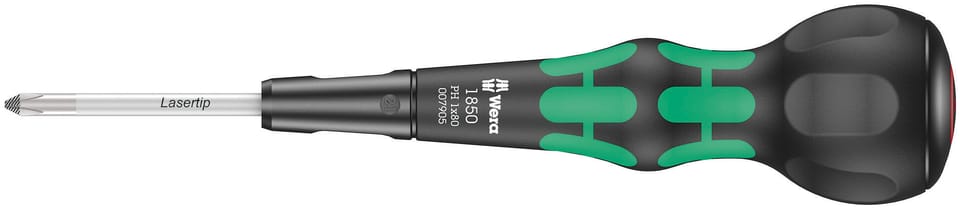 Wkrętak z rękojeścią Kraftform serii 1800 do śrub z gniazdem krzyżowym Phillips. Rękojeść doskonale leży w dłoni. Kulisty kształt umożliwia przenoszenie wysokich momentów obrotowych. Miękkie strefy chwytu zapewniają dobry chwyt i bezstratne przenoszenie sił. Twarde strefy chwytu umożliwiają przenoszenie dużych sił, nawet przy nacisku nasadą dłoni. Wgłębienia na palce w górnej części rękojeści ułatwiają precyzyjną regulację podczas wkręcania. Smukłe przejście między rękojeścią a trzpieniem ułatwia dotarcie nawet do trudno dostępnych i głęboko położonych śrub w wąskich przestrzeniach. Zabezpieczenie na końcu rękojeści utrudnia staczanie się narzędzia z miejsca pracy. Końcówka Lasertip posiada mikroskopijne rowki wypalane promieniem lasera, tworzące chropowatą powierzchnię, która dosłownie "wgryza się" w gniazdo śruby. Zapobiega to wyślizgnięciu się narzędzia.