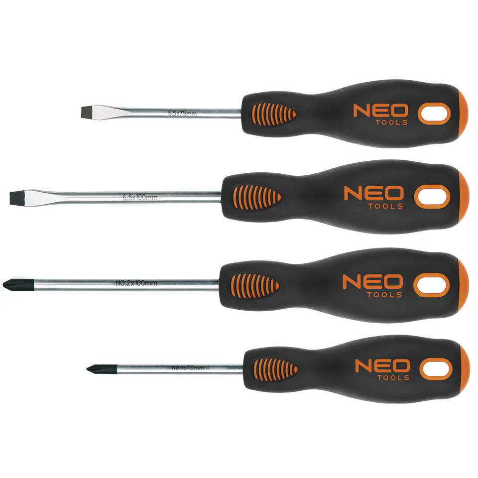Wkrętaki, zestaw 4 szt., stal S2, twardość końcówki roboczej 56 HRc, magnetyczna końcówka, trójgraniasty kształt uchwytu, wyprofilowane oparcie dla kciuka, uchwyt pokryty tworzywem TPR odpornym na działanie chemikaliów, olejów mineralnych, smarów, rozmiary: płaskie 5.0 x 75 mm, 6.0 x 100 mm, krzyżowe PH1 x 75 mm, PH2 x 100 mm, TÜV
