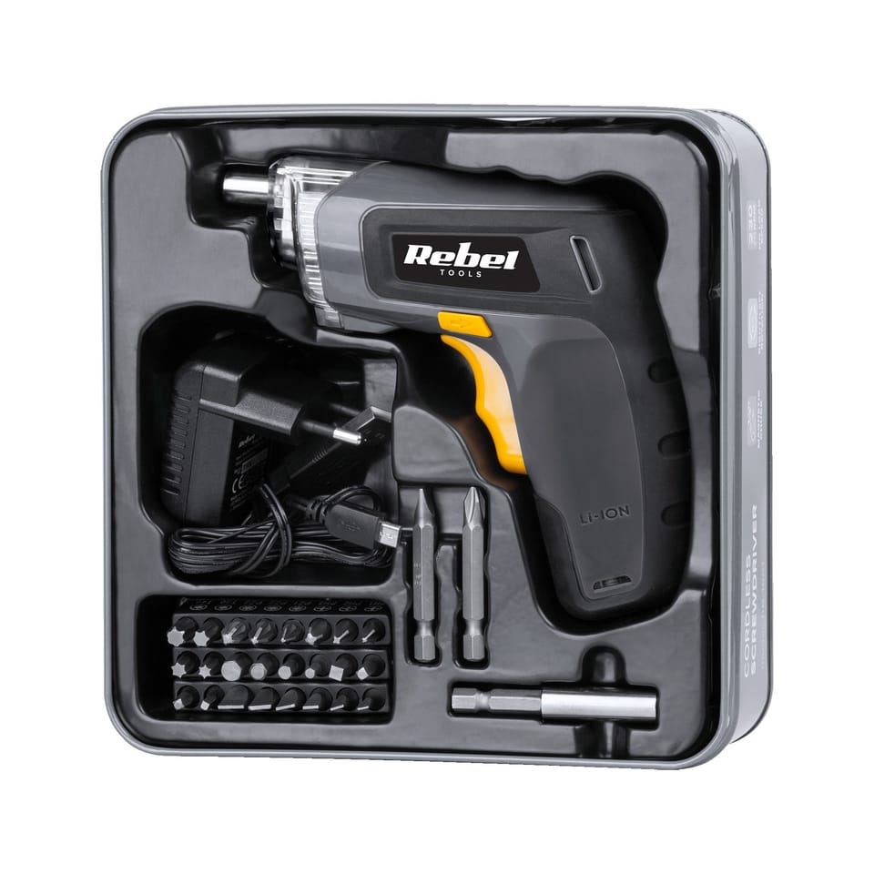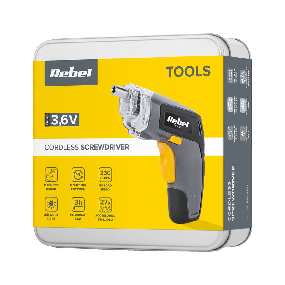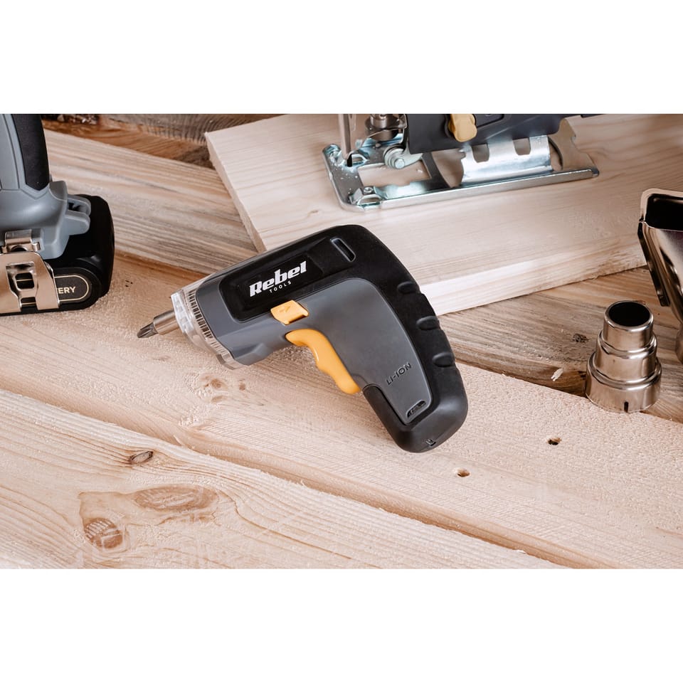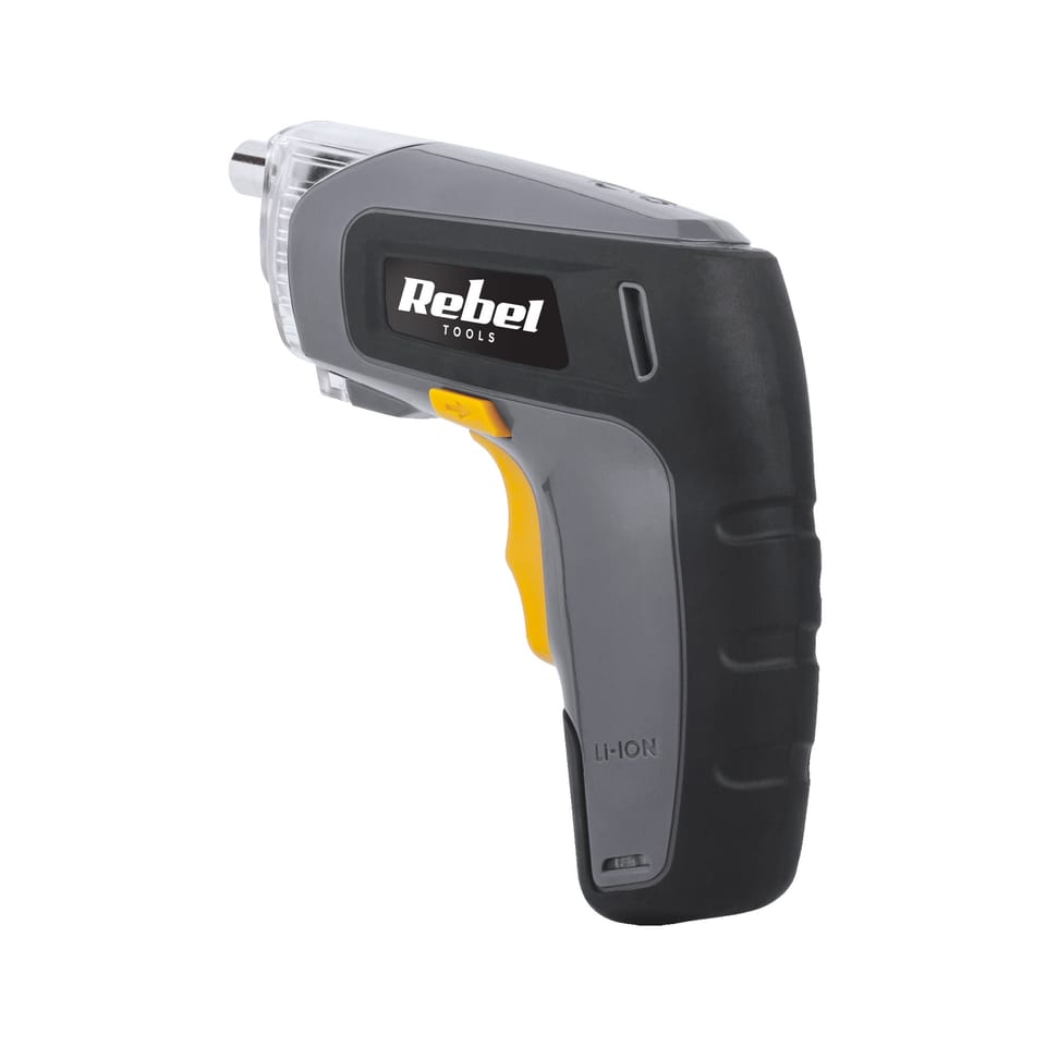 Już po chwili zauważysz jak komfortowa w użyciu jest wkrętarka Rebel Tools. Urządzenie zostało wyposażone w magnetyczny uchwyt, dlatego zmiana końcówek odbywa się niezwykle szybko. Narzędzie posiada także światło robocze, które podświetli Ci miejsce wkręcania. Jedną z cech, które docenisz od pierwszych chwil użytkowania to bezprzewodowa praca. Litowo-jonowy akumulator o pojemności 1,3 Ah, w jaki została wyposażona wkrętarka, gwarantuje długą żywotność i dużą wydajność. Zaletami urządzenia są także cicha praca oraz lekka konstrukcja ? tylko 380 g, które znacznie podnoszą komfort podczas pracy.