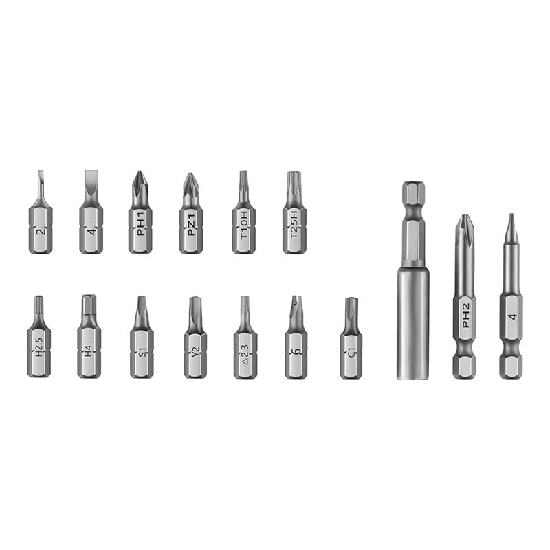 W zestawie z wkrętakiem znajdziesz 24 bity o długości 25 mm i 50 mm. Do ich wykonania zastosowano stal S2, dzięki czemu są bardzo wytrzymałe i odporne na uszkodzenia. Komplet obejmuje najpopularniejsze typy, w tym Slotted, Phillips, Pozidriv, Square, Torx TR, Hex, Y-Type, Spanner, Triangle i U-Type. Ponadto magnetyczny uchwyt ułatwia osadzanie bitów i stabilizuje je podczas pracy.
