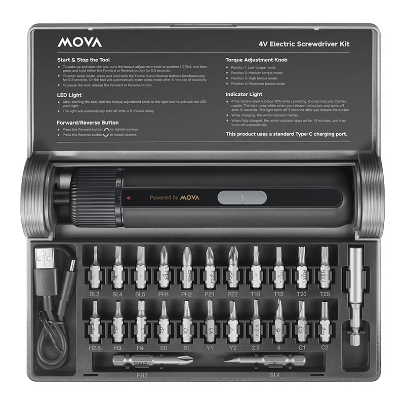 MOVA MSD008 to wkrętak elektryczny 4V z momentem obrotowym do 8 N·m w trybie Electric i do 12 N·m w trybie Manual. W połączeniu z zestawem 24 bitów umożliwia sprawną pracę przy wielu rodzajach śrub – sprawdzi się w domowym warsztacie i nie tylko. Dodatkowo w zestawie znajdziesz kompaktowe etui, która ułatwia przechowywanie i organizację narzędzi.