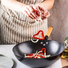 Czy wok nadaje się do smażenia bez tłuszczu? Tak, marmurkowa powłoka non-stick pozwala smażyć z minimalną ilością oleju.