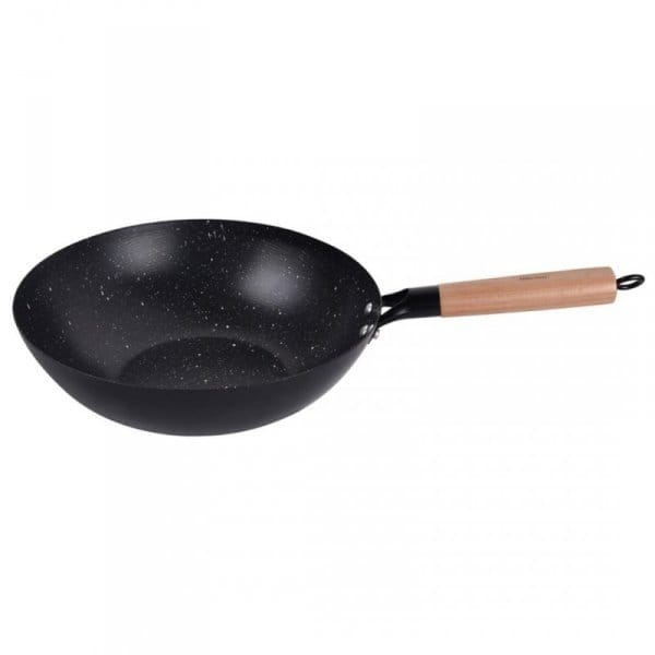 Dzięki płaskiemu dnu WOK zachowuje stabilność na każdej kuchence, a drewniany uchwyt gwarantuje pewny chwyt i bezpieczeństwo podczas gotowania. To uniwersalne naczynie, które sprawdzi się zarówno w kuchni azjatyckiej, jak i w codziennym gotowaniu w domu.