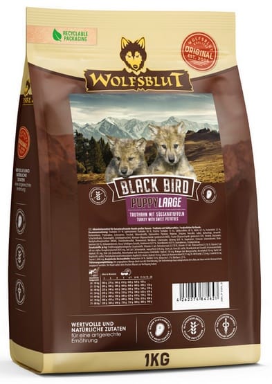 Wolfsblut – bo natura wie najlepiej!Wolfsblut Black Bird Puppy Large – pełnoporcjowa karma dla szczeniąt dużych rasWolfsblut Black Bird Puppy Large to specjalnie opracowana formuła żywieniowa, stworzona z myślą o szczeniętach dużych ras w okresie intensywnego wzrostu i rozwoju. Zawiera aż 51% indyka – w tym świeże i suszone mięso – lekkostrawnego źródła wysokiej jakości białka, niezbędnego do budowy silnych mięśni i zdrowych tkanek.Karma nie zawiera zbóż ani kurczaka, co czyni ją odpowiednią również dla wrażliwych szczeniąt z tendencją do nietolerancji pokarmowych.Naturalna moc mięsa indyka✔ Indyk – lekkostrawne źródło wysokowartościowego białka, delikatne dla układu pokarmowego.✔ Tłuszcz z indyka – zapewnia energię i wspiera zdrową skórę oraz sierść.Delikatna formuła wspierająca rozwój szczeniąt dużych ras✔ Immutop® – koncentrat topinamburu wspierający odporność i równowagę mikroflory jelitowej.✔ Nukleotydy – wspomagają rozwój układu odpornościowego i regenerację komórek.✔ Prebiotyki MOS i FOS – wspierają zdrowie jelit i odporność od najmłodszych miesięcy.Wspierająca zdrowie kompozycja roślinna✔ Słodkie ziemniaki i ciecierzyca – naturalne źródła węglowodanów, dostarczające energii bez glutenu.✔ Pasternak, pomidor i koper włoski – wspomagają trawienie i florę jelitową.✔ Superfoods: jeżyny, jagody, maliny, aronia, czarna porzeczka, bez czarny – bogactwo antyoksydantów wspierających rozwój i odporność.✔ Zioła: tymianek, majeranek, oregano, pietruszka, szałwia – naturalne wsparcie trawienia i funkcji metabolicznych.✔ Siemię lniane – źródło kwasów omega-3 wspierających mózg i sierść.✔ Pokrzywa, mniszek, głóg – naturalne składniki wzmacniające organizm szczenięcia.✔ Ekstrakt z juki Schidigera – pomaga ograniczyć nieprzyjemny zapach odchodów.Dlaczego warto wybrać Wolfsblut Black Bird Puppy Large?To pełnowartościowa karma bez zbóż i kurczaka, idealnie dopasowana do potrzeb rosnących psów dużych ras. Zbilansowana, lekkostrawna i bogata w składniki wspierające odporność i rozwój od pierwszych miesięcy życia.Wolfsblut Black Bird Puppy Large – bo zdrowy start zaczyna się od zrozumienia natury Twojego szczeniaka. 🦃🍠🌿Składniki:Indyk 51% (suszony indyk 36%, świeży indyk 15%), słodkie ziemniaki 28%, dynia 6,5%, tłuszcz z indyka 5,5%, ciecierzyca, pasternak, siemię lniane, koper włoski, minerały, topinambur, tymianek, majeranek, oregano, pietruszka, szałwia, opuncja figowa, amarantus, skrzyp polny, granat, małża zielona, mannanooligosacharydy (prebiotyczne MOS), fruktooligosacharydy (prebiotyczne FOS), pomidory, glukozamina, metylosulfonylometan (MSM), siarczan chondroityny, pokrzywa, głóg, mniszek lekarski, żeń-szeń 0,05%, owoce dzikiej róży, czarna porzeczka, jeżyny 0,02%, bez czarny, ekstrakt z juki schidigera, maliny 0,01%, borówki 0,01%, jagody aronii Cetyl myristoleate.Analiza składu: