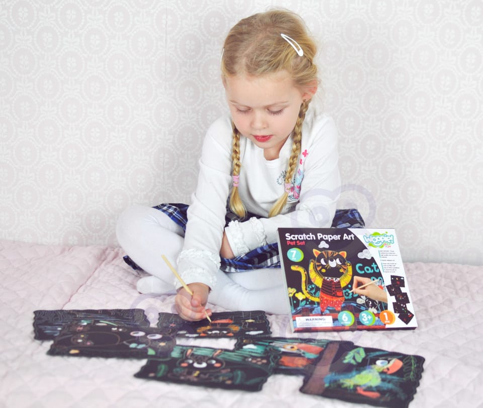 Rozbudź wyobraźnie dziecka magicznymi wydrapywankami od marki WOOPIE z serii ART&FUN! Za pomocą drewnianego rysika dziecko może wydrapywać, nowe formy/wzory zakryte na planszy i następnie obserwować jak kolory tworzą niezwykły, spójny obraz z motywem zwierząt! Zestaw zawiera 7 elementów, w tym 6 planszy do wydrapania oraz rysik. Plansze zawierają obrazy z kotem, psem, ślimakiem, królikiem, rybką oraz papugą. Dziecko można zabrać zestaw wszędzie dzięki wygodnemu opakowaniu z zamknięciem. Zabawka rozwija zdolności motoryczne dziecka oraz rozbudza kreatywność i wyobraźnie!