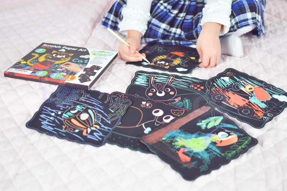 - - zestaw zawiera 7 elementów: 6 planszy do wydrapania oraz rysik