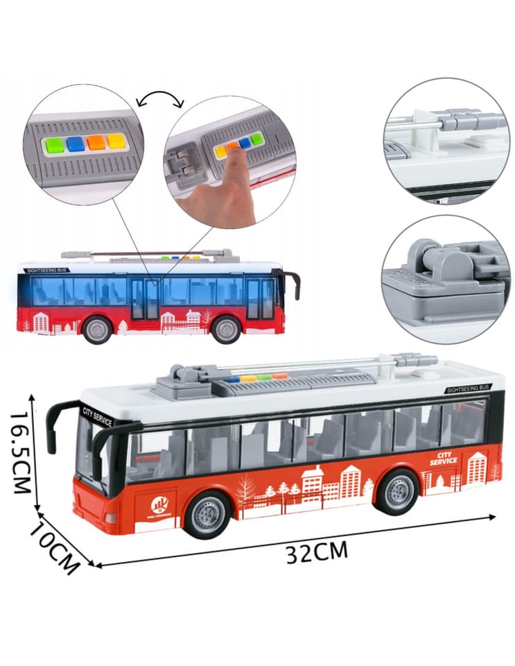 Wielka frajda dla małych miłośników komunikacji miejskiej! Realistyczny model trolejbusu miejskiego marki WOOPIE to świetna zabawka dla dzieci, które uwielbiają pojazdy i odgrywanie scenek z codziennego życia. Pojazd posiada wiele wbudowanych funkcji, które nie pozwolą się nudzić. Wyposażony jest w efekty dźwiękowe, podświetlenie wnętrza, ruchome pantografy oraz otwierane drzwi. Zabawka posiada cztery gumowe koła oraz napęd frykcyjny. Wystarczy go pchnąć dp przodu lub do tyłu i sam przejedzie nawet klika metrów w linii prostej.
