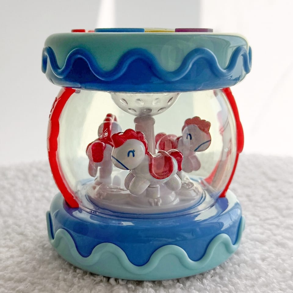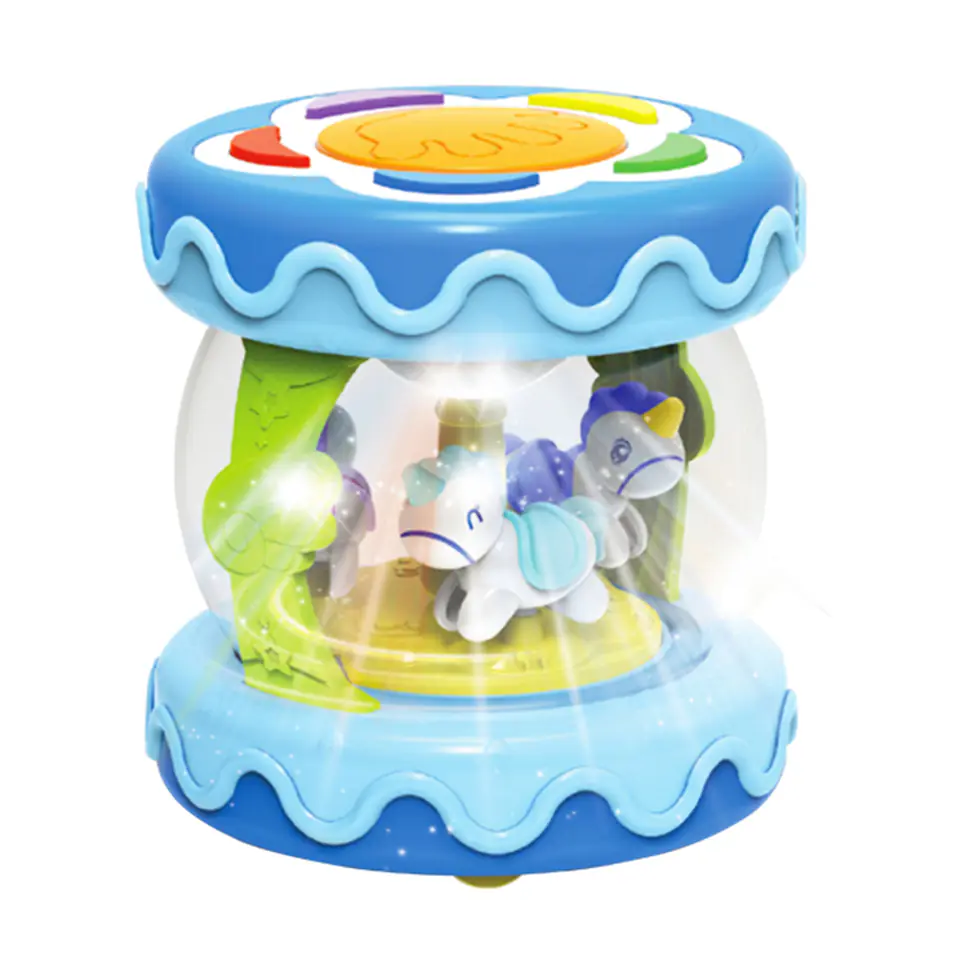 Odkryj magiczny świat muzyki i światła dzięki Muzycznemu Bębenkowi Pozytywce 3w1 od marki WOOPIE BABY. Ta interaktywna zabawka łączy w sobie trzy funkcje: bębenka, pozytywki oraz projektora gwiazd. Jest to idealny umilacz przy zasypianiu, który jednocześnie wysoce rozwija zmysły dziecka. Bębenek posiada 6 guzików dźwiękowych, które odtwarzają m.in. melodie perkusyjne i odgłosy zwierząt. W trybie pozytywki koniki obracają się w środku, a w nocy zabawka pełni funkcję projektora, imitując świecące gwiazdy. Dodatkowo, dzięki kształtowi walca, zachęca malucha do nauki raczkowania. Posiada tryb czuwania, który wyłącza dźwięki po 60 sekundach bez użycia, oszczędzając baterie.