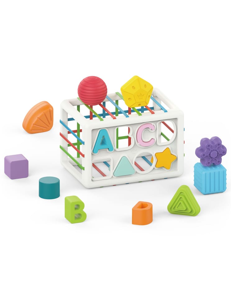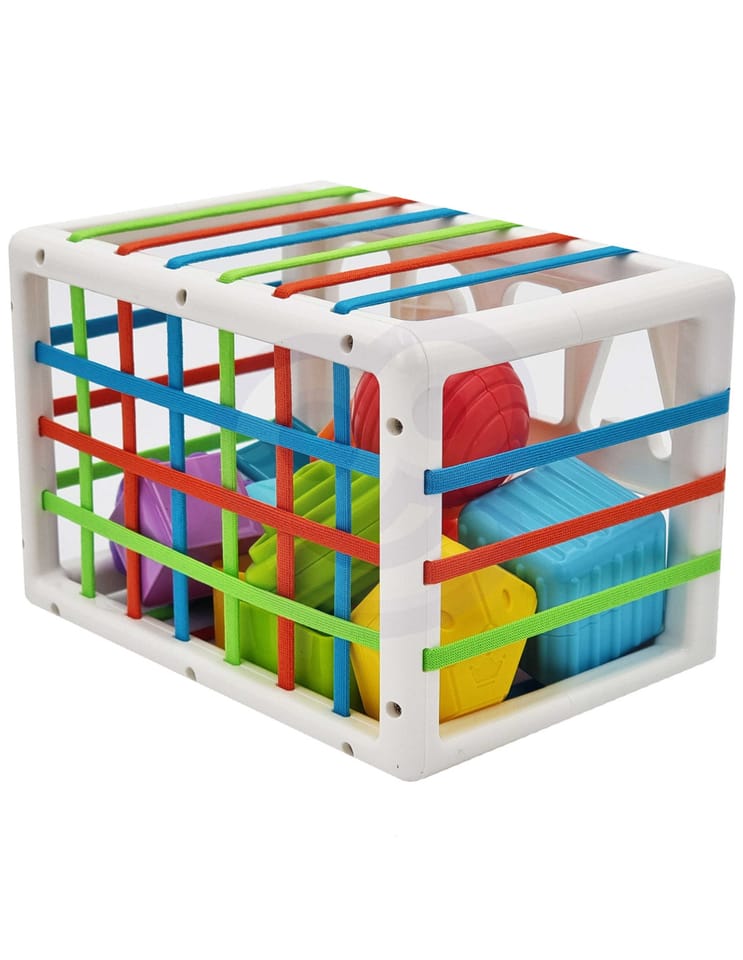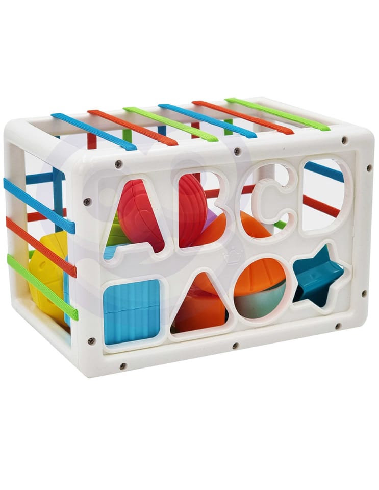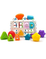 - - w zestawie: kostka-sorter + 14 różnorodnych twardych klocków,