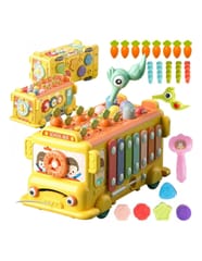 Interaktywny Autobus Edukacyjny 6w1 to wyjątkowa, wielofunkcyjna zabawka zaprojektowana z myślą o wszechstronnym rozwoju najmłodszych. Ten kolorowy pojazd łączy w sobie mnóstwo fascynujących aktywności, które przyciągną uwagę każdego malucha, zachęcając do samodzielnego odkrywania świata. Wyposażony w różnorodne dźwięki i efekty, autobus stymuluje zmysły i gwarantuje wiele godzin wciągającej zabawy. Zabawka oferuje liczne atrakcje – na bocznej ścianie znajdują się kolorowe cymbałki wprowadzające w świat muzyki, a na dachu umieszczono ruchome elementy, które dziecko może wciskać za pomocą dołączonego młoteczka. Dodatkowo autobus pełni funkcję sortera kształtów, dzięki któremu maluch uczy się dopasowywać klocki, a wyciąganie ich ułatwia otwierana klapa z tyłu pojazdu. Praktyczny sznureczek sprawia, że autobusik może towarzyszyć dziecku w każdym spacerze jako wesoła zabawka do ciągnięcia.