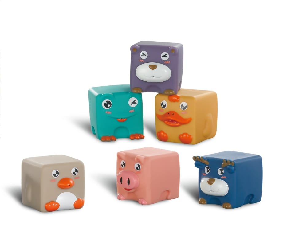 WOOPIE Układanka Klocki Sensoryczne zaciekawią każdego malucha. Dzięki ciekawym kształtom, kolorom i możliwości wydawania dźwięku przy ściśnięciu doskonale stymulują rozwój koordynacji wzrokowo-słuchowej, motorycznej dziecka oraz zmysłu dotyku. Klocki posiadają wypukłe kształty z wizerunkami zwierząt. Klocki są miękkie i przyjemne w dotyku oraz wydają dźwięki podczas ściskania. Dzięki swojej budowie sprawdzą się również doskonale jako gryzak. Przez wizerunki zwierząt dziecko może zapoznać się ze światem przyrody. Produkt w pięknej stonowanej kolorystyce przeznaczony dla dzieci od 12 miesiąca życia.