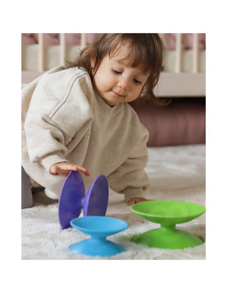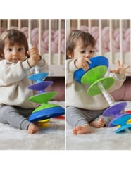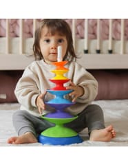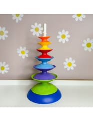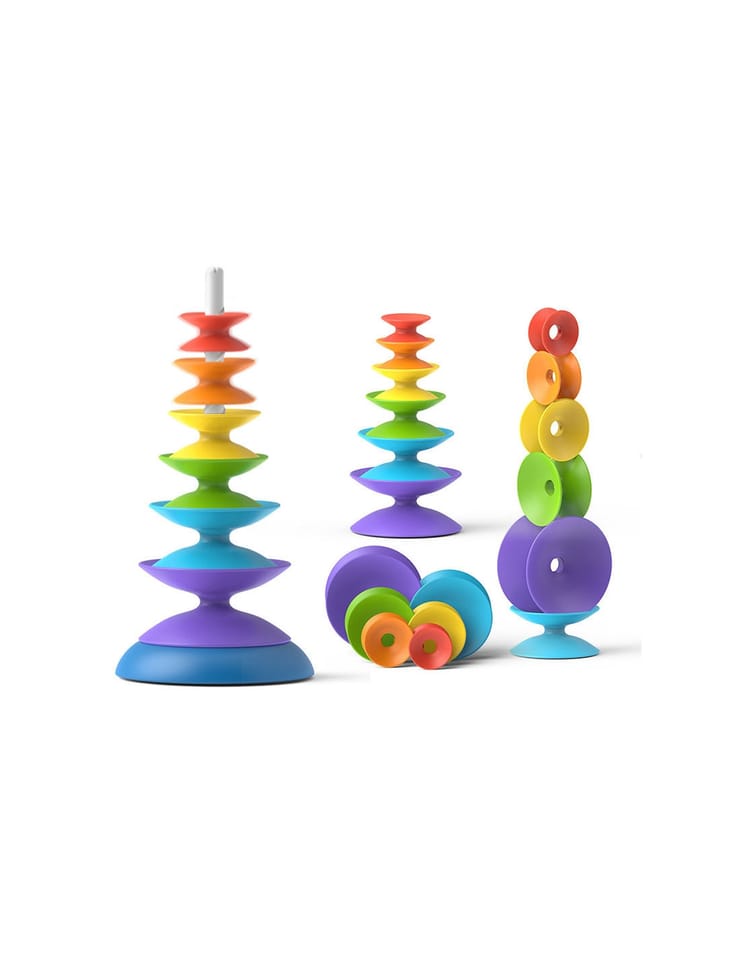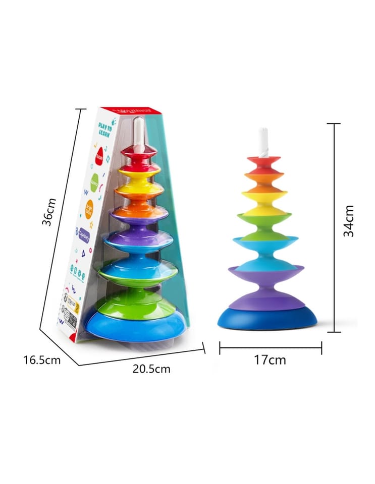 Każda z 7 szpulek różni się rozmiarem i kolorem, zachęcając malucha do eksplorowania, porównywania i układania według własnych pomysłów. Zabawka świetnie nada się do ćwiczenia zdolności manualnych i motorycznych – dziecko doskonali chwyt, koordynację ręka–oko oraz rozpoznawanie kształtów i kolorów.