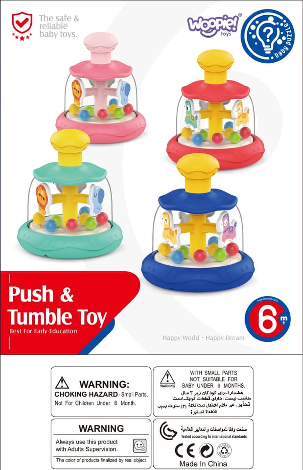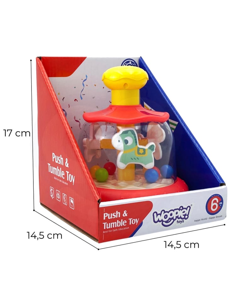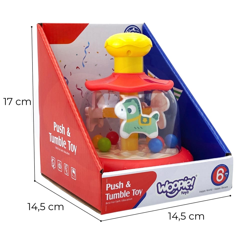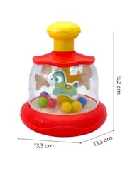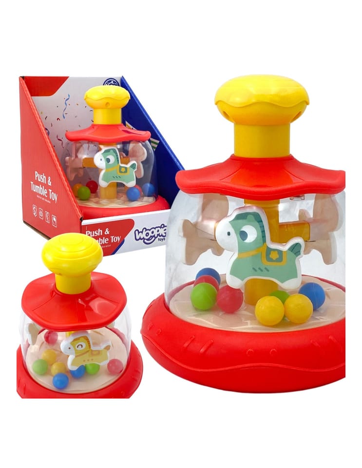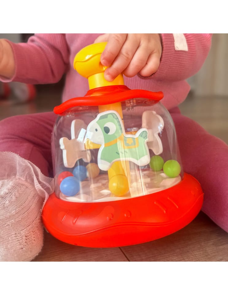 Pozwól swojemu dziecku odkrywać świat poprzez zabawę dzięki wspaniałej zabawce "Zakręcony Bączek"! Ta innowacyjna i kolorowa zabawka została stworzona z myślą o najmłodszych odkrywcach, dostarczając nie tylko mnóstwo radości, ale również wspomagając ich rozwój w kluczowych obszarach. Dzięki solidnej konstrukcji i żywym barwom, zabawka przyciąga uwagę dziecka jednocześnie wspierając rozwój ich zdolności motorycznych, sensorycznych i poznawczych. Jest to idealny wybór dla każdego rodzica, który pragnie, aby ich maluch rozwijał się w atmosferze zabawy i radości. Wystarczy, że dziecko naciśnie górną, żółtą część karuzeli, a konik i kuleczki zaczną się poruszać po całej karuzeli.