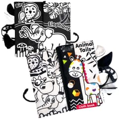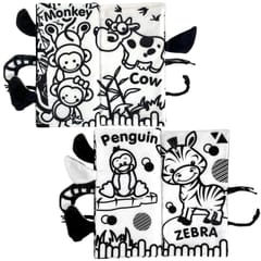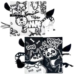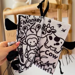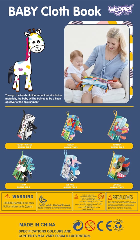 Książeczka kontrastowa od marki Woopie stworzona specjalnie dla maluchów. Szeleszczące i bardzo miękkie w dotyku strony rozwijają zmysły maluszka pełniąc funkcję sensoryczną. Czarno-białe ilustracje trenują wzrok i spostrzegawczość. W każdej ze stron wystają ogonki różnych zwierzątek, łapiąc za nię maluszek ćwiczy koordynację wzrokowo-ruchową. Książeczka może służyć jako zawieszka do wózka lub łóżeczka, mocowana na rzep.