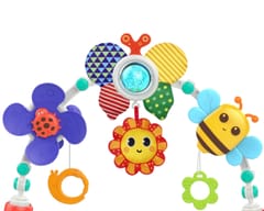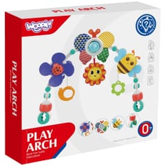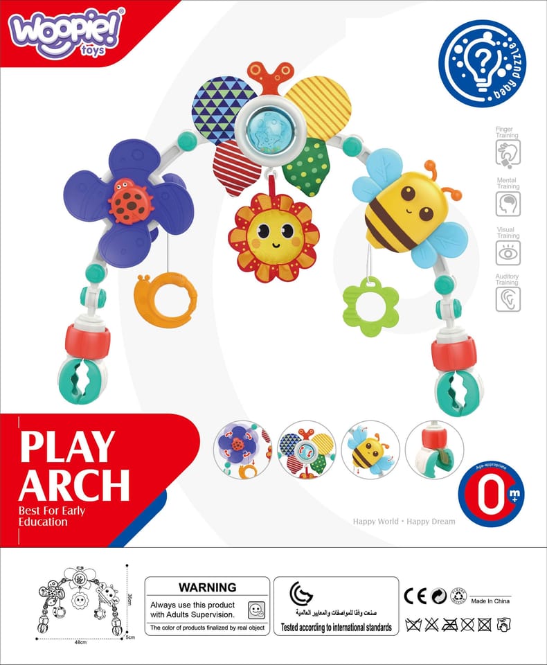 Pałąk Łuk z Zabawkami od marki WOOPIE to uniwersalna zabawka, która doda uroku i rozrywki każdemu wózkowi, fotelikowi czy łóżeczku. Jest niezwykle elastyczny, dzięki czemu bez problemu można go zamocować praktycznie wszędzie. Na pałąku znajdują się różne zabawki: wiatraczek z biedronką, które obraca się i drga po wprawieniu w ruch, słoneczko, które piszczy przy ściskaniu, grzechotka motylek z przeźroczystą kulą, w której skaczą kolorowe kuleczki oraz szeleszczący materiał, zawieszka ślimak i kwiatek, który może służyć jako gryzaczek. Każda z tych zabawek ma inną fakturę, co stymuluje zmysł dotyku dziecka i pomaga w rozwijaniu jego zdolności motorycznych.