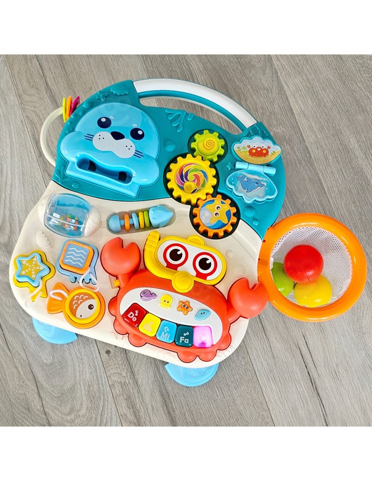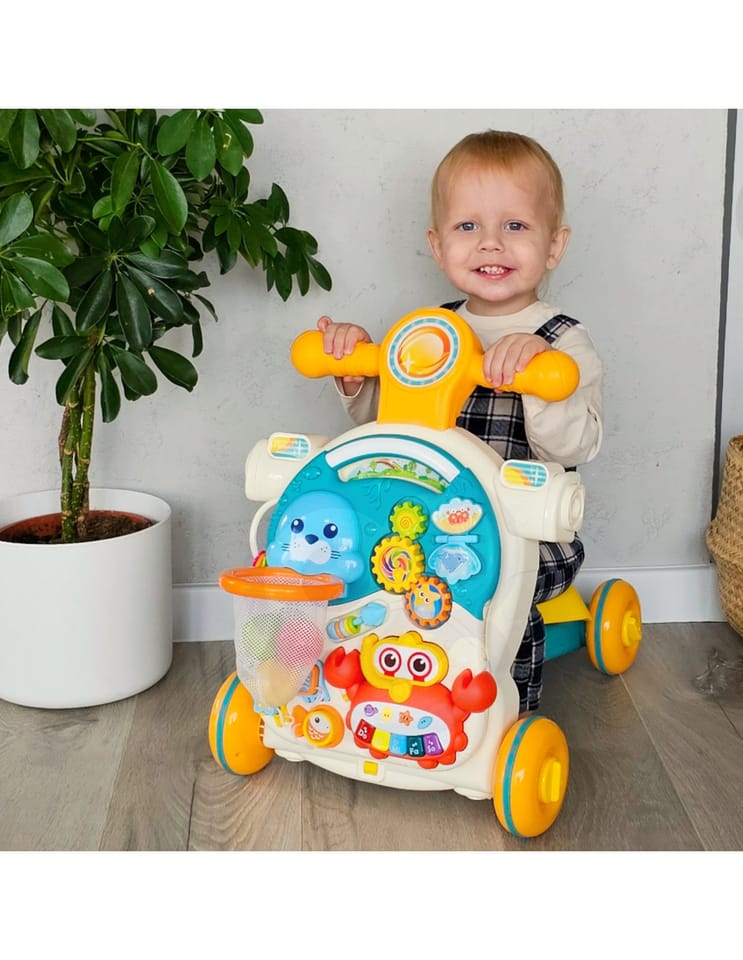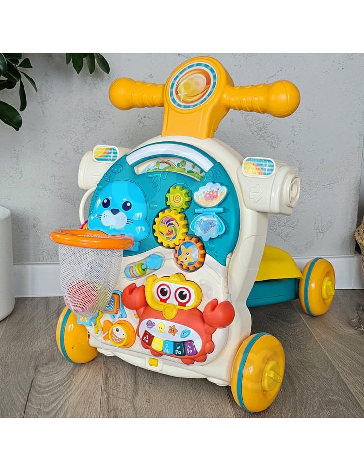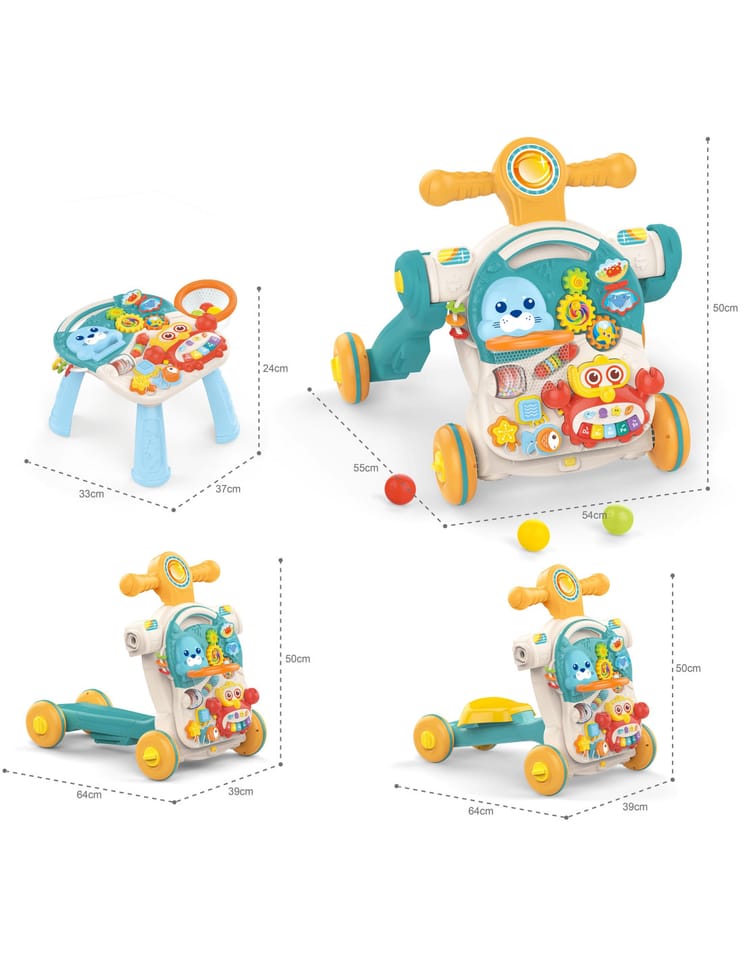 - - Wielofunkcyjna konstrukcja 4w1: pchacz, chodzik, jeździk, stolik edukacyjny
