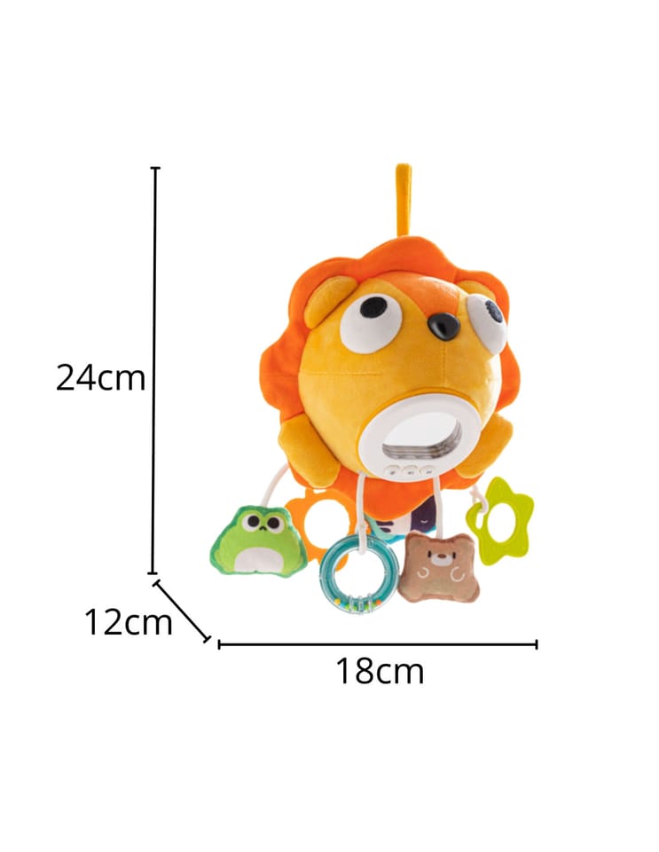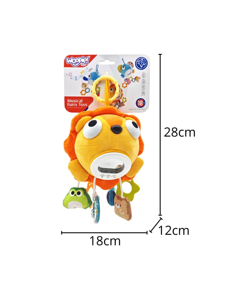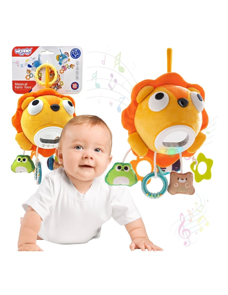 Ten pluszowy, muzyczny lew od marki Woopie to idealny towarzysz snu i zabawy dla każdego malucha. Połączenie delikatnej muzyki, uspokajających światełek i różnorodnych tekstur sprawia, że zabawka jest doskonałym narzędziem do stymulacji zmysłów dziecka i zapewnia mu poczucie bezpieczeństwa. Zabawka ma kształt uroczego, pluszowego lwa z lusterkiem. Do jego tułowia przymocowane są sześc , różnych zawieszek w różnych kształtach. Dwie z nich to bezpieczny gryzak, jedna pełni funkcje grzechotki a pozostałe zabawne pluszaki stymulują rozwój motoryczny i sensoryczny dziecka. Zabawkę można łatwo zawiesić na łóżeczku, wózku lub foteliku samochodowym dzięki praktycznemu uchwytowi, co zapewnia rozrywkę i ukojenie w każdej sytuacji.