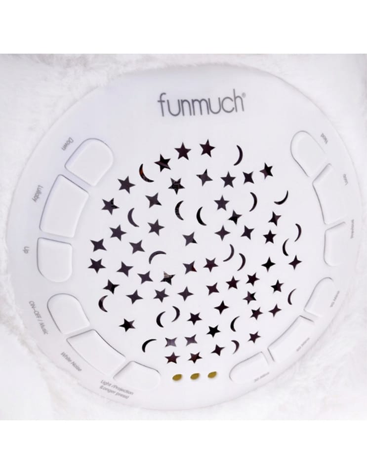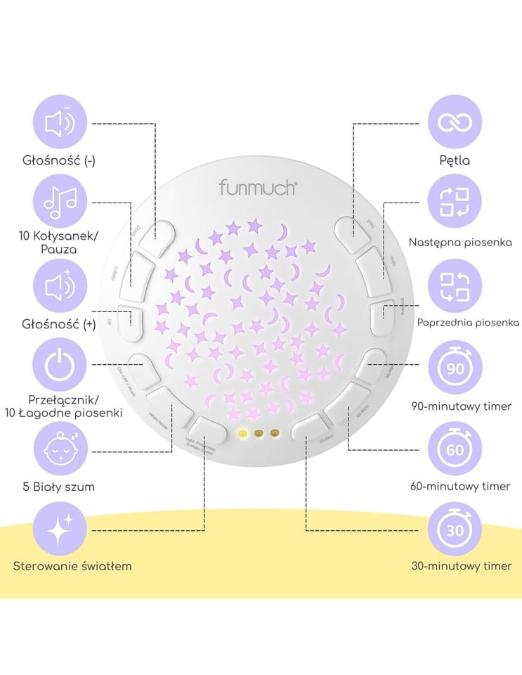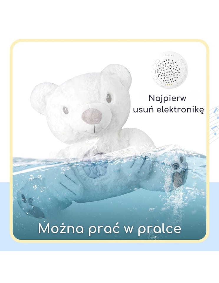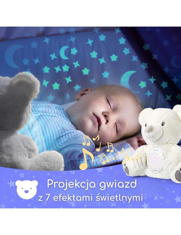 Mięciutki Miś Polarny z Projektorem od marki Woopie to idealny towarzysz snu dla każdego maluszka. Ta urocza przytulanka, wykonana z bezpiecznej, bawełnianej tkaniny, łączy w sobie funkcje projektora świetlnego i uspokajacza z muzyką. Miś pomaga ukoić dziecko do snu, emitując na suficie gwieździste niebo z księżycami w 7 różnych efektach świetlnych. Moduł dźwiękowy oferuje bogatą gamę uspokajających dźwięków: 10 delikatnych kołysanek oraz 5 rodzajów białego szumu. Moduł ma wbudowany timer z trzema opcjami czasu (30, 60 lub 90 minut), a także funkcję pętli (Loop) do ciągłego odtwarzania. Dodatkową zaletą jest możliwość prania misia w pralce (po wyjęciu modułu elektronicznego).