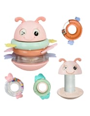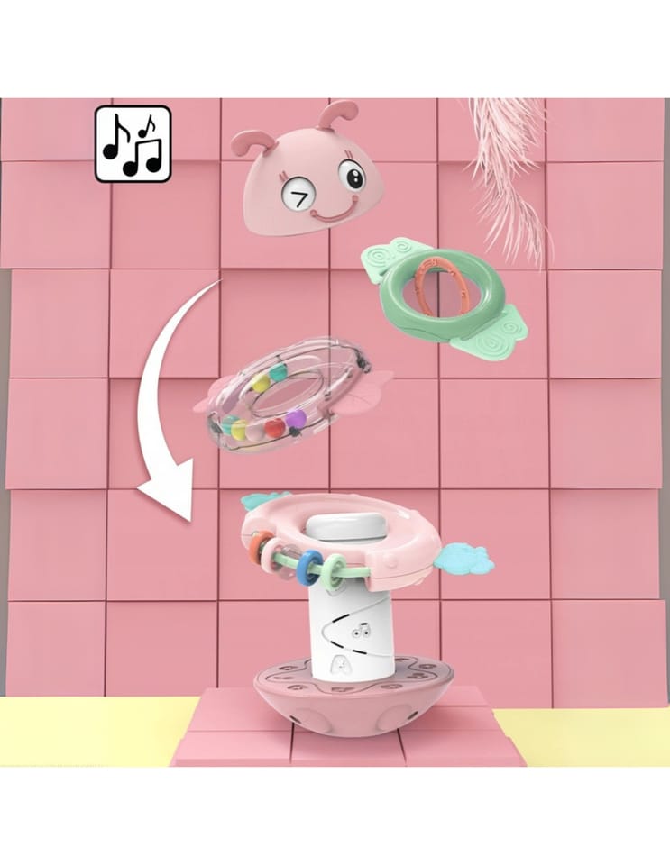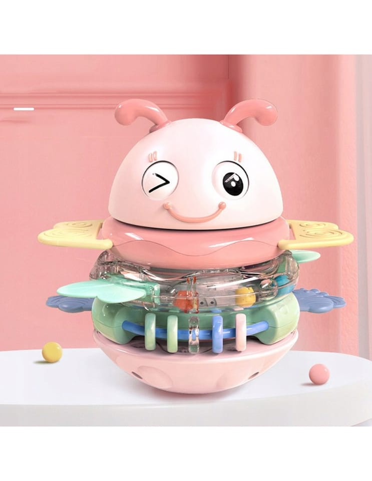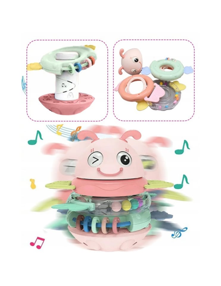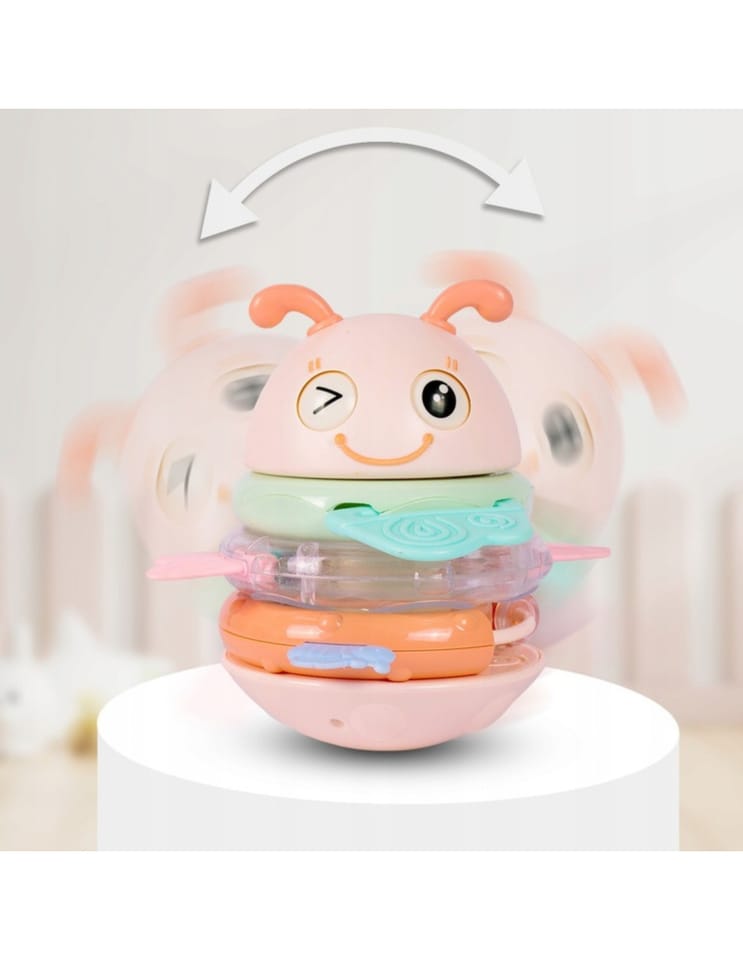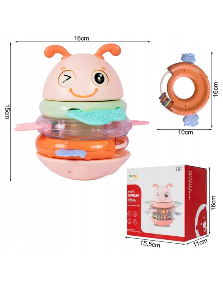 Żółta Pszczółka Wańka Wstańka 2w1 marki Woopie to wielozadaniowa zabawka sensoryczna, która zachwyca zarówno swoją funkcjonalnością, jak i wyglądem! Dzięki połączeniu grzechotek i gryzaków z efektami dźwiękowymi zapewnia maluchowi wszechstronną zabawę i jednocześnie wspiera jego rozwój już od pierwszych miesięcy życia. Trzy kolorowe obręcze, które pełnią funkcję zarówno grzechotek, jak i gryzaków, można nakładać na specjalny palik, który w zależności od wybranego trybu będzie odtwarzał piosenkę albo wydawał zabawny dźwięk. Główka uroczej pszczółki z ruchomymi oczkami wieńczy całość, tworząc atrakcyjną formę, która przyciąga wzrok dziecka. Zabawka została zaprojektowana z myślą o najmłodszych dzieciach. Delikatne silikonowe wypustki na obręczach idealnie sprawdzają się jako gryzaki podczas ząbkowania, a bezpieczne, zaokrąglone kształty umożliwiają swobodne chwytanie i manipulowanie. Wszystkie elementy są kolorowe, różnorodne w fakturze i odpowiednio duże, co stymuluje zmysły, ciekawość i motorykę dziecka. Dzięki zaokrąglonej podstawie zabawa pod wpływem ruchu delikatnie się kołysze, a jej wywrócenie wcale nie jest takie łatwe! To nie tylko zabawka, ale towarzysz codziennej nauki i rozwoju.