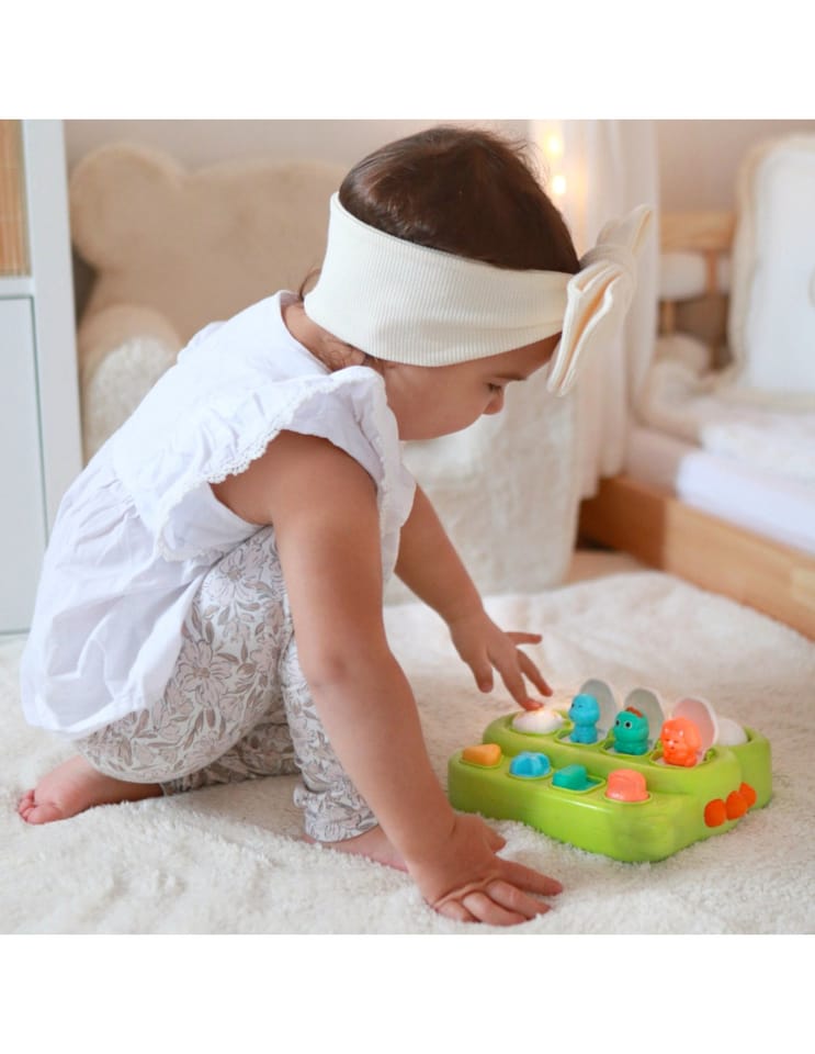 Wyskakujące Dinozaury od marki WOOPIE BABY to doskonałe połączenie nauki i zabawy dla najmłodszych odkrywców. Gdy przełącznik, pokrętło lub przyciski zostaną aktywowane, ukryty dinozaur wyskakuje ze swojego miejsca. Ta interaktywna zabawka popup jest świetnie wykonana, solidna i trwała, co zapobiega jej szybkiemu zniszczeniu przez aktywnego malucha. Całość zaprojektowano w kształcie wesołego dinozaura, by jeszcze skuteczniej przyciągać uwagę i zachęcać dziecko do zabawy. Dodatkową atrakcją jest kręcące się oko, które wydaje dźwięki grzechotki. To doskonały pomysł na prezent na różne okazje, który nie tylko dostarcza mnóstwa radości, ale też skutecznie pomaga w rozwijaniu zdolności motorycznych oraz zrozumieniu związku przyczynowo-skutkowego.