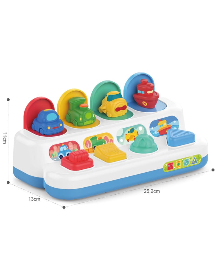 Wyskakujące Kolorowe Pojazdy POP UP od marki WOOPIE Baby - to połączenie zabawy i nauki, które zachwyci Twojego malucha. Po naciśnięciu przełącznika lub przycisku kolorowe autko wyskakuje – co budzi radość i ciekawość. Dzięki mechanizmowi „pop-up” maluch sam odkrywa efekt przyczynowo-skutkowy, kiedy jego akcja prowadzi do reakcji zabawki. Zabawka jest solidnie wykonana z trwałego plastiku, co zapewnia długie użytkowanie i bezpieczeństwo. To świetny prezent, który wspiera rozwój motoryczny, zmysłowy i poznawczy dziecka, a jednocześnie daje rodzicowi chwilę wytchnienia.
