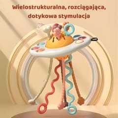 Zabawka Sensoryczna Montessori Gryzak "Przeciąganka" w kształcie UFO od marki WOOPIE to nie tylko doskonała rozrywka, ale i innowacyjny sposób na wspieranie rozwoju Twojego niemowlaka. Zachęca do odkrywania przez zmysły, skupia na rozwoju koordynacji i motoryki oraz łagodzi dyskomfort związany z ząbkowaniem. Zestaw zawiera kolorowe, bezpieczne i łatwe do uchwycenia przez małe rączki sznurki z różnorodnymi teksturami, które pobudzają do działania i eksploracji, jednocześnie oferując ulgę podczas ząbkowania. Pociąganie za sznurek wydaje różnorodne dźwięki i wibracje. Ponadto zabawka jest wyposażona w rząd miękkich przycisków, które zachęcają do dotyku i przyciskania. Podwyższona pozycja pobudza ciekawość dziecka i ćwiczy zręczność małych paluszków Ten sensoryczny gryzak to idealny prezent dla niemowlaka, który łączy rozrywkę z nauką. Dzięki niemu możesz zapewnić Twojemu dziecku zdrowy rozwój i godziny angażującej zabawy. Zapewnij komfort i rozwój swojemu maluchowi!