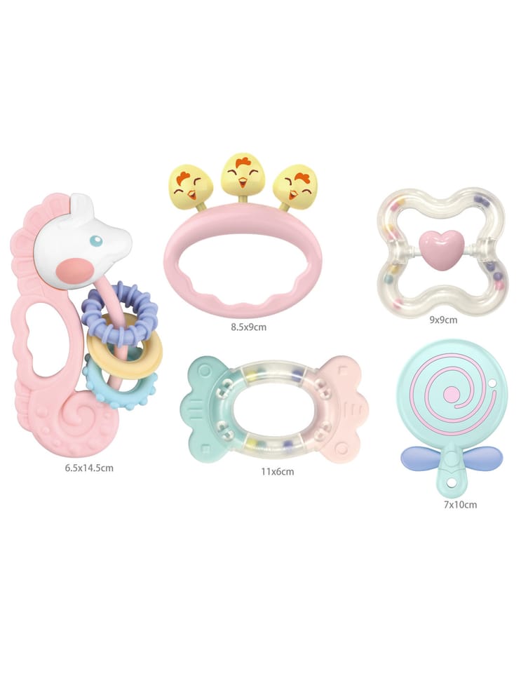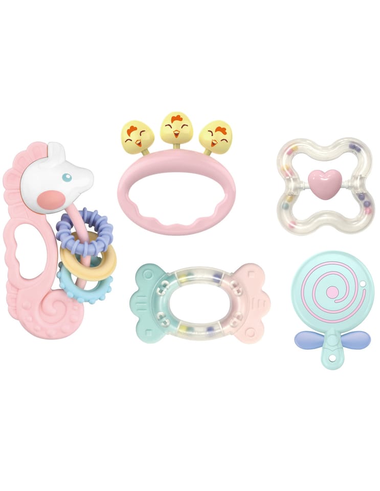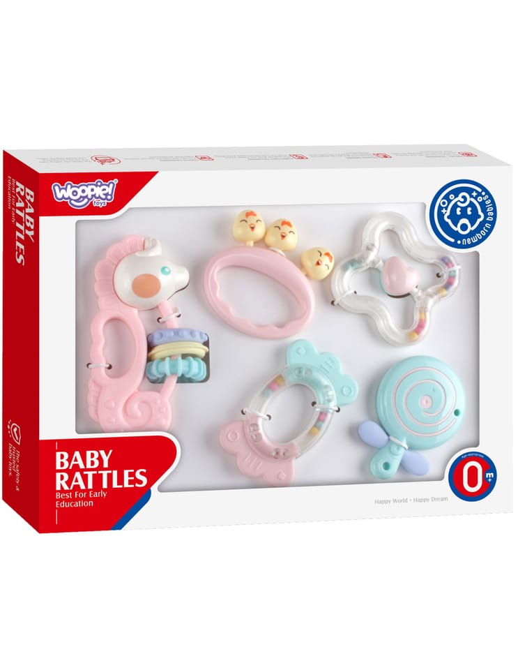 Zestaw Gryzaków-Grzechotek dla dzieci od marki WOOPIE zawiera 5 różnokolorowych elementów, zaprojektowanych tak, aby pomagać dziecku podczas ząbkowania. Gryzaki nie tylko przynoszą ulgę obolałym dziąsłom, ale także stymulują rozwój wzroku i słuchu. Dodatkowo klęsły i wypukły kształt oraz różne tekstury stymulują rozwój zmysłu dotyku.Charakterystyka: