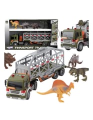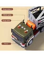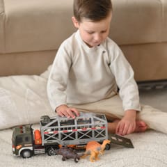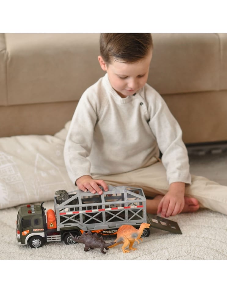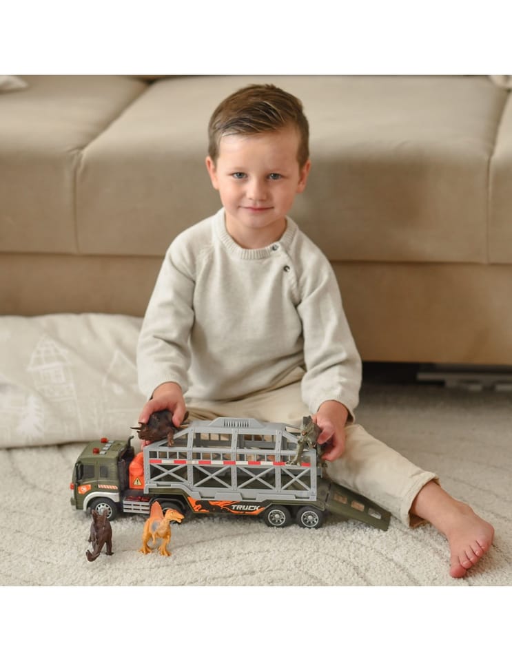 Ciężarówka Transporter Dinozaurów od marki WOOPIE to idealna propozycja dla każdego małego fana prehistorycznych stworzeń i motoryzacji. Ten imponujący zestaw łączy w sobie dużą ciężarówkę z lawetą oraz figurki dinozaurów, zapewniając wiele godzin kreatywnej zabawy. Pojazd wyposażony jest w napęd frykcyjny, dzięki czemu po popchnięciu sam jedzie do przodu. Atrakcyjność zabawy zwiększają efekty świetlne i dźwiękowe: na dachu kabiny znajdują się 4 przyciski uruchamiające odgłosy silnika, klakson, syrenę oraz dźwięki cofania, którym towarzyszą migające światła. Laweta posiada otwieraną klatkę oraz rozkładaną rampę, co pozwala na łatwy załadunek i rozładunek dinozaurów. Naczepę można również odczepić od ciągnika, co daje dodatkowe możliwości zabawy.