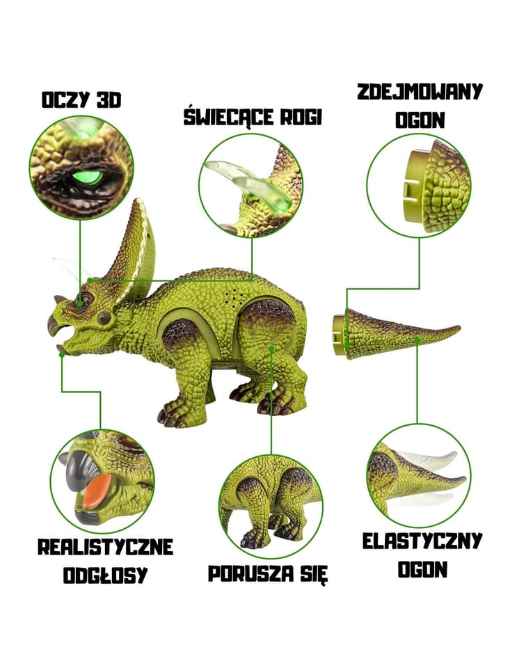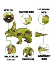 - - efekty świetlne: kolorowe, świecące rogi oraz świecące oczy dinozaura