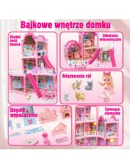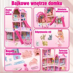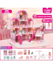 Poznaj wspaniały, trzypiętrowy domek dla lalek z różowym dachem, który stanie się ulubionym miejscem zabawy Twojego dziecka! Ta piękna willa o imponujących wymiarach została zaprojektowana z dbałością o każdy szczegół, co sprawia, że wygląda jak prawdziwy dom. Zestaw zawiera aż 296 elementów do złożenia, w tym bogate wyposażenie wnętrza i urocze mebelki, które pozwolą małej projektantce na samodzielne zaaranżowanie każdego z pomieszczeń. Domek posiada oświetlenie nocne, które dodaje mu magicznego charakteru. To idealna zabawka, która rozwija kreatywność, wyobraźnię oraz umiejętności manualne. W zestawie znajduje się wszystko, co potrzebne, aby stworzyć wymarzony dom dla lalek: od mebelków, przez akcesoria, aż po uroczą lalkę-mieszkankę. Zabawa w dom nigdy nie była tak realistyczna i wciągająca! Zjeżdżalnia, schody i taras to dodatkowe elementy, które urozmaicą zabawę i pozwolą na odgrywanie wielu scenariuszy. Dzięki solidnej konstrukcji domek zapewnia długie godziny fantastycznej i bezpiecznej zabawy.