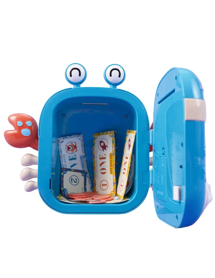 Elektroniczna Skarbonka na Kod od marki WOOPIE to wielofunkcyjny produkt, który na pewno spodoba się twojemu dziecku! Krab zaprojektowany jest w taki sposób aby można było przechowywać w nim monety, banknoty i inne mniejsze zabawki. Skarbonka składa się ze specjalnych otworów na banknot i monetę, czytnika linii papilarnych, klawiatury do wpisywania kodu oraz pokrętła do otwierania. Ponad to Elektroniczny krab wydaje z siebie dźwięki! W razie potrzeby zabawkę można łatwo zresetować i ustawić nowy kod