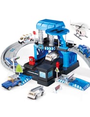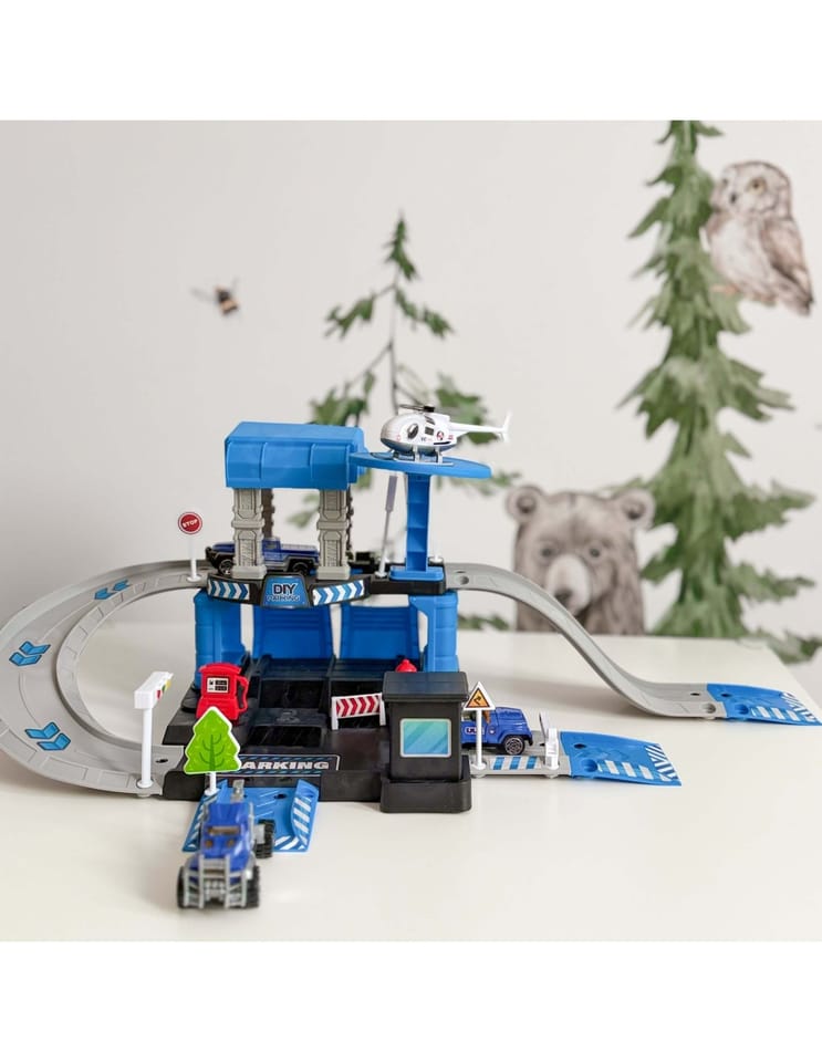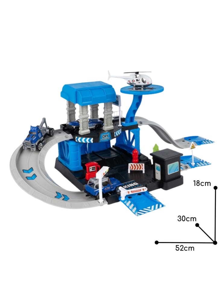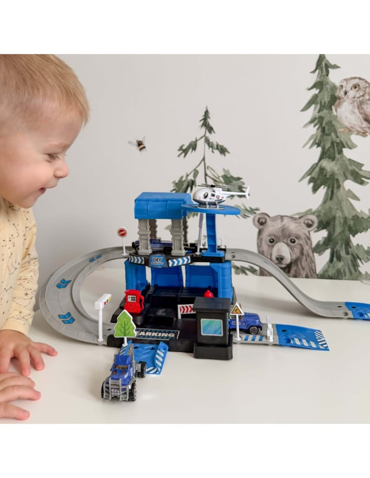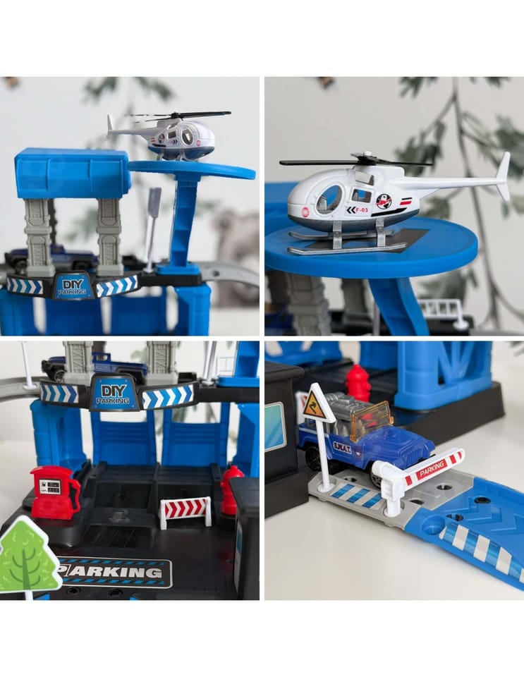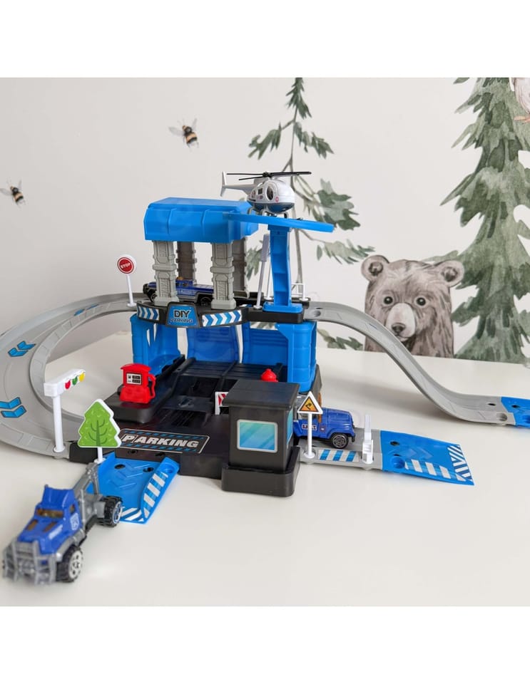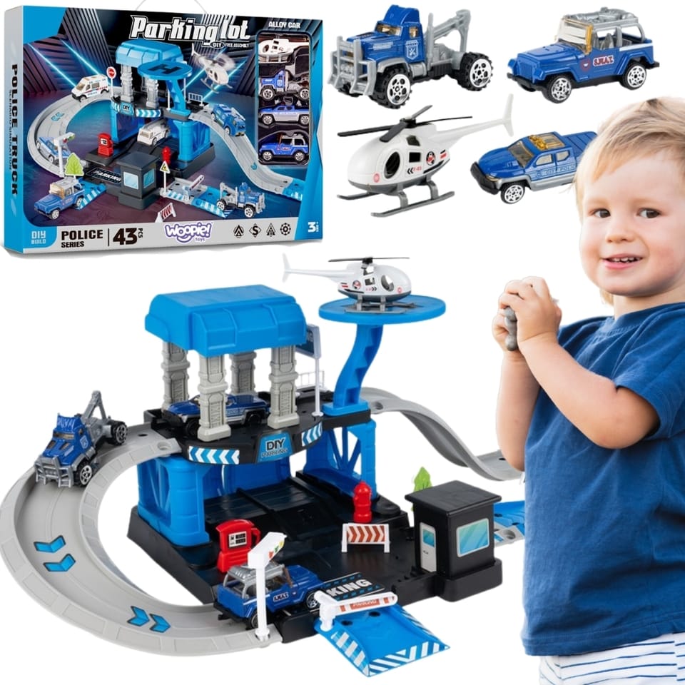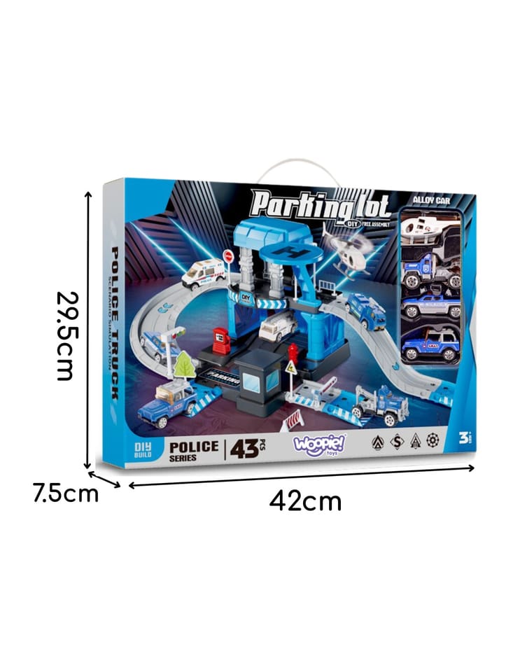 Parking policyjny od marki Woopie z akcesoriami i pojazdami to fantastyczny zestaw tematyczny dla każdego małego miłośnika motoryzacji i służb mundurowych! Zabawka zachwyca bogactwem detali, ilością elementów, żywą kolorystyką i wieloma możliwościami zabawy. Dwupoziomowy parking z rampami, lądowiskiem dla helikoptera i licznymi akcesoriami pozwala dziecku na tworzenie własnych scenariuszy zabawy, ograniczonymi tylko wyobraźnią. Trzy metalowe samochodziki i helikopter pozwolą wykorzystać każdą z funkcji garażu i pozwolą na zabawę w gronie rodzeństwa lub przyjaciół oraz wcielenie się w postać małego policjanta.
