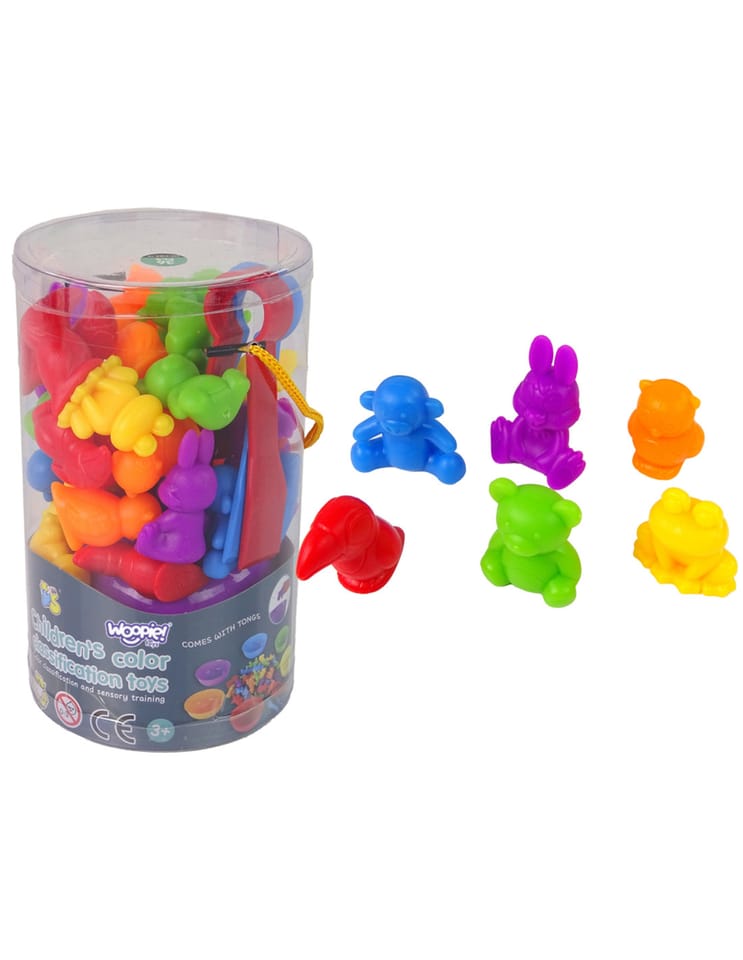 Zabawka Edukacyjna Sorter - Zwierzęta od marki WOOPIE to prosta, ale skuteczna pomoc w nauce i zabawie. Gra polega na wysypaniu wszystkich figurek na środek, a następnie za pomocą szczypczyków przeniesienie każdego elementu do odpowiedniej miseczki. Dodatkowo zabawka ma wiele edukacyjnych możliwości wykorzystania. Poza nauką kolorów, figurki można użyć, również do nauki liczenia. Zestawem mogą bawić się jednocześnie dwoje dzieci i uczyć się dzielenia oraz współpracy lub rywalizacji na czas. Zestaw jest super alternatywą dla standardowego sposobu uczenia - nauka przez zabawę!