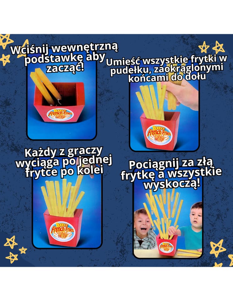 - Przegrywa osoba, która wyciągnie złą frytkę co spowoduje wypadnięcie wszystkich frytek.