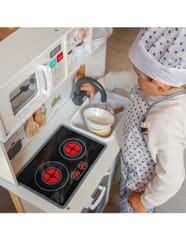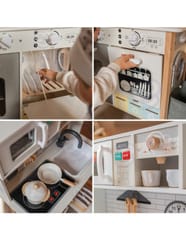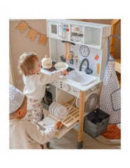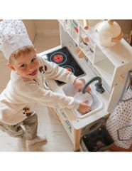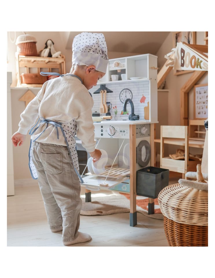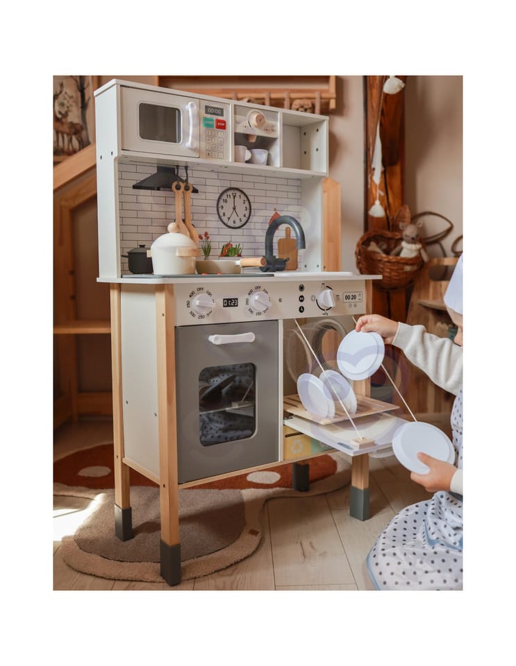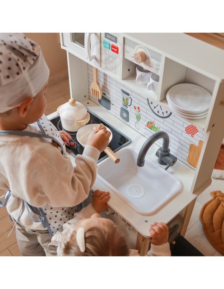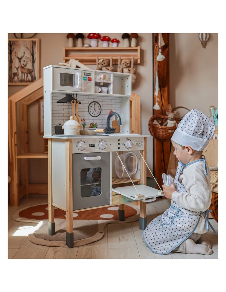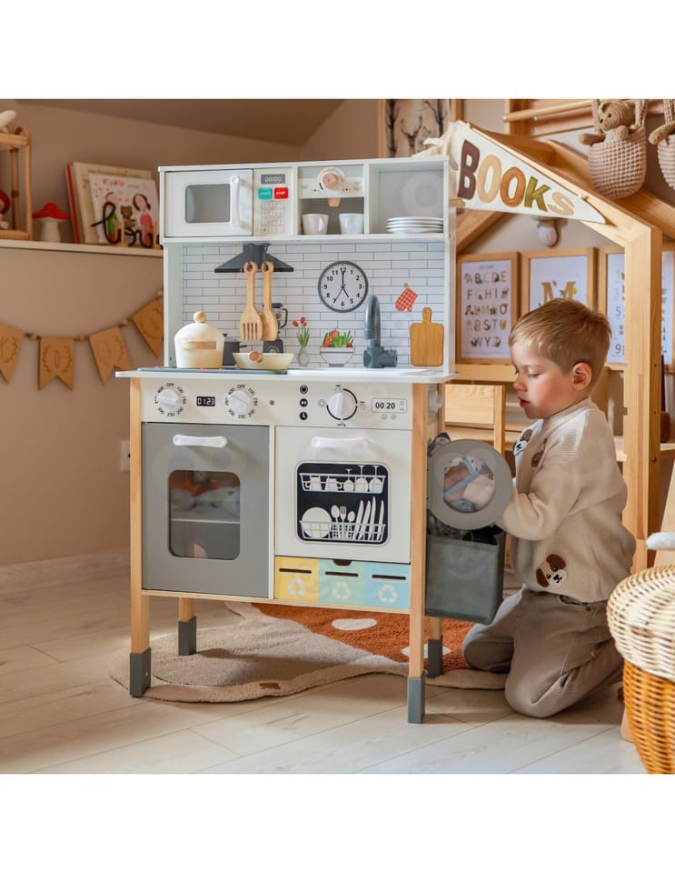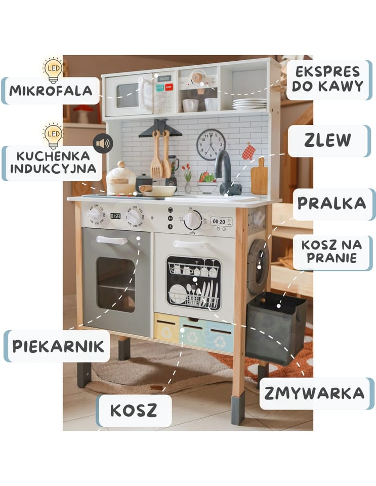 Wielofunkcyjny zestaw kuchenny to drewniana kuchnia stworzona z myślą o małych pasjonatach gotowania i odkrywania świata. Zestaw łączy w sobie ponad 9 różnych funkcji, rozwijając kreatywność i ucząc codziennych czynności poprzez zabawę. Idealny do pokoju dziecięcego, sali zabaw lub przedszkola.