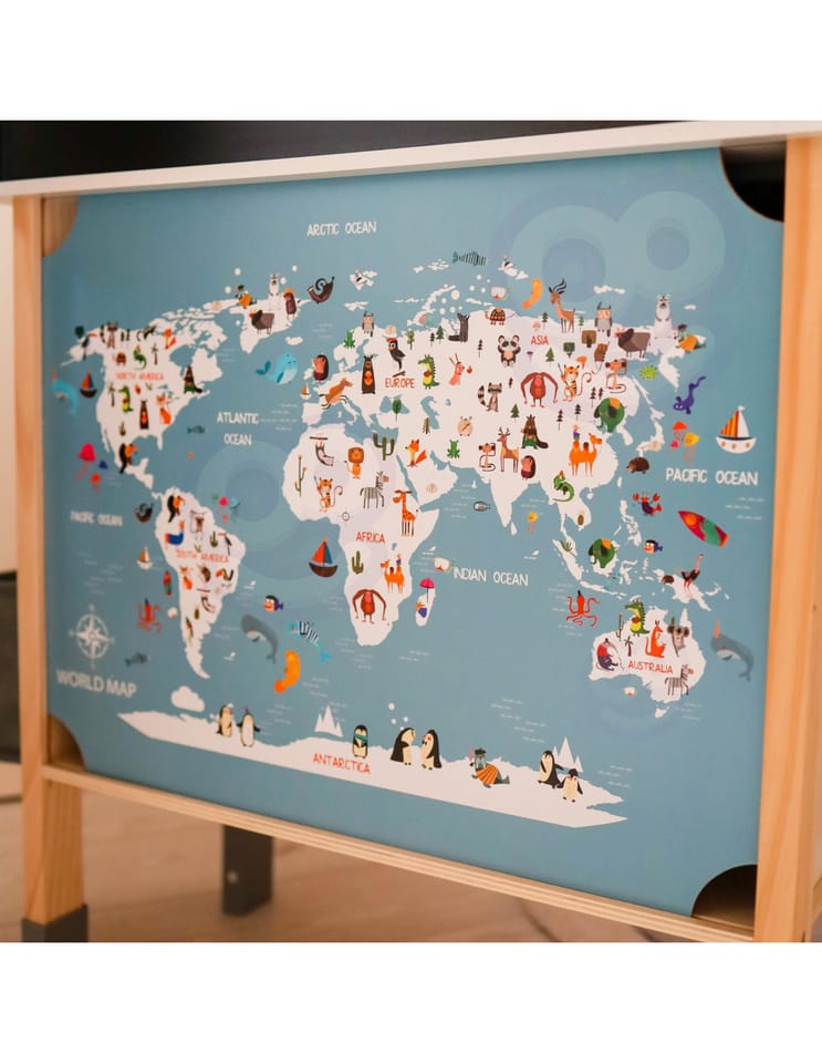 - - tył zestawu kryje tablicę kredową oraz kolorową mapę świata inspirującą do nauki i rysowania