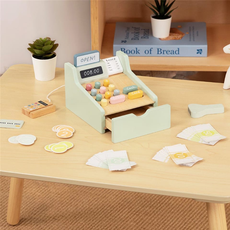 - - Motorykę - Drewniana kasa rozwija motorykę małą poprzez manipulowanie kolorowymi przyciskami, monetami i banknotami. Dziecko ćwiczy precyzyjne ruchy dłoni używając skanera, otwierając i zamykając szufladę, naciskając przyciski oraz przeliczając pieniądze. Układanie i wkładanie karty kredytowej do czytnika dodatkowo wzmacnia koordynację ręka-oko.