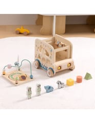 - - Ruchome elementy: koraliki na pętli motorycznej, koła zębate, sorter kształtów, obracane klocki z obrazkami