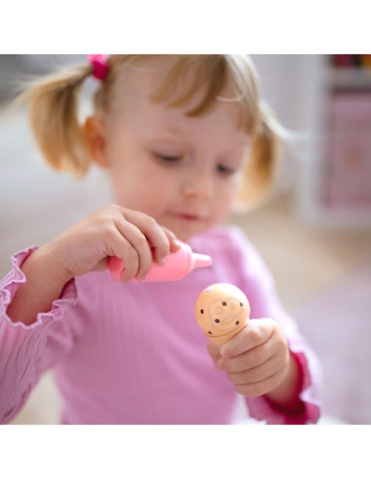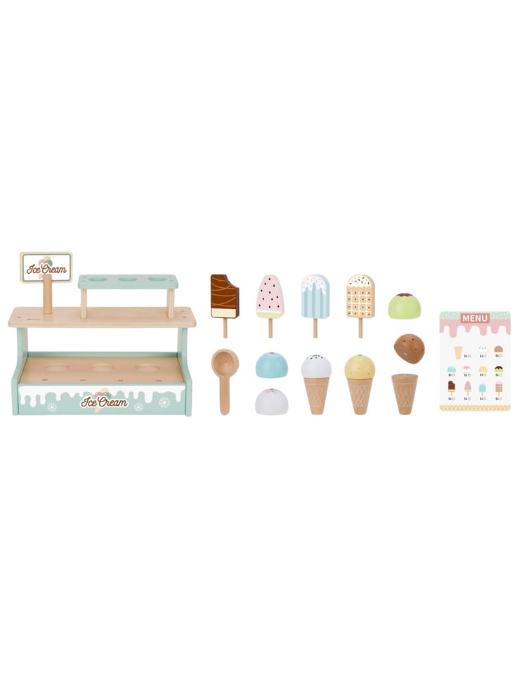 - - Realistyczne akcesoria: lody na patyku, gałki, wafelki, menu i łyżka