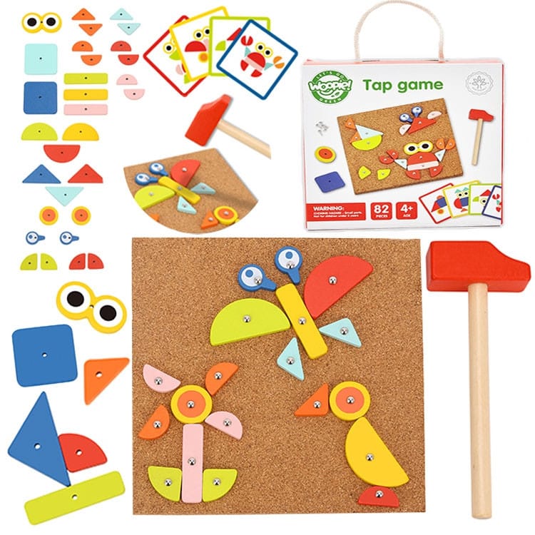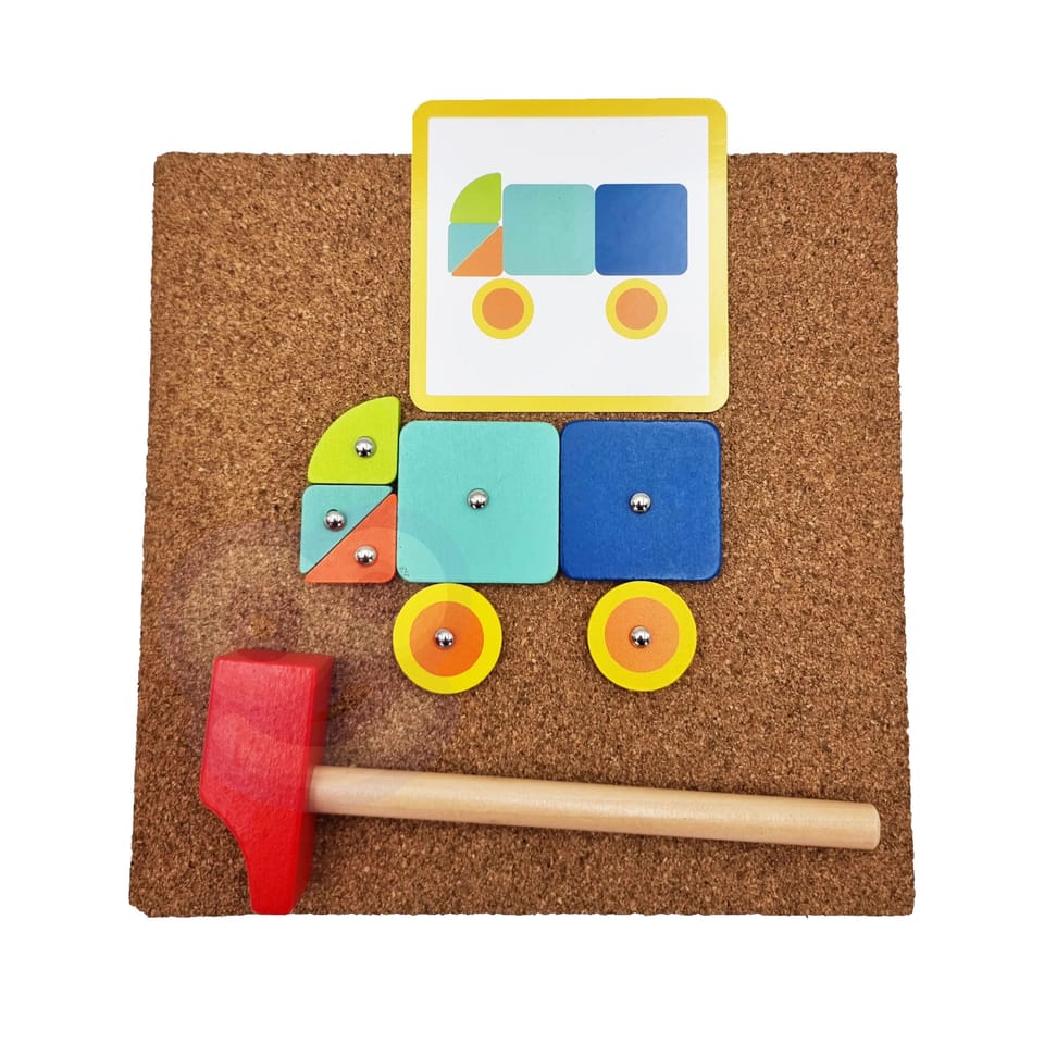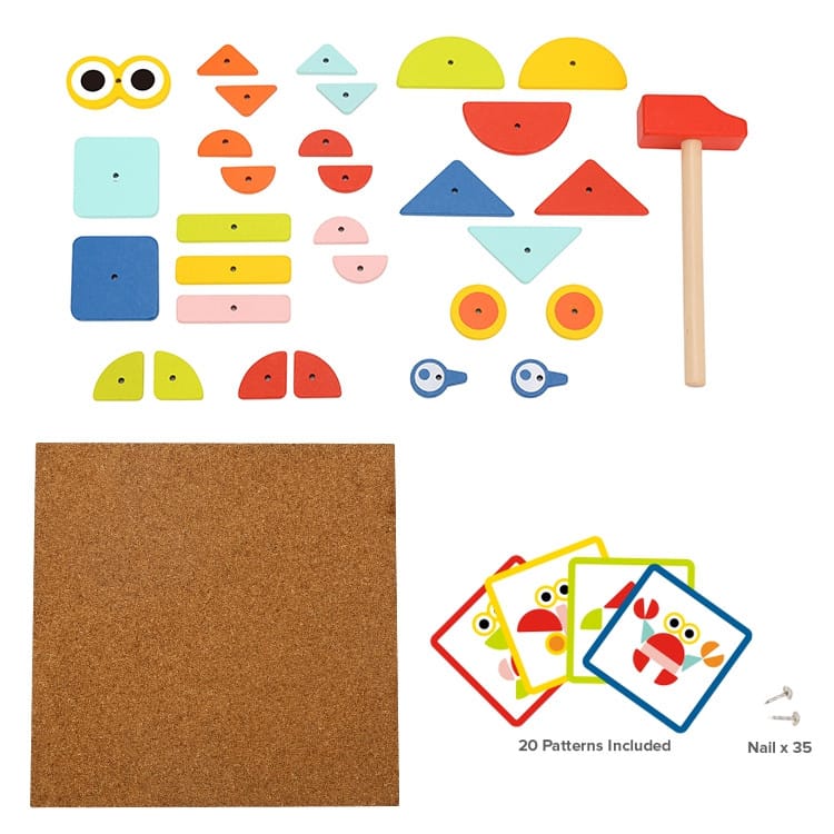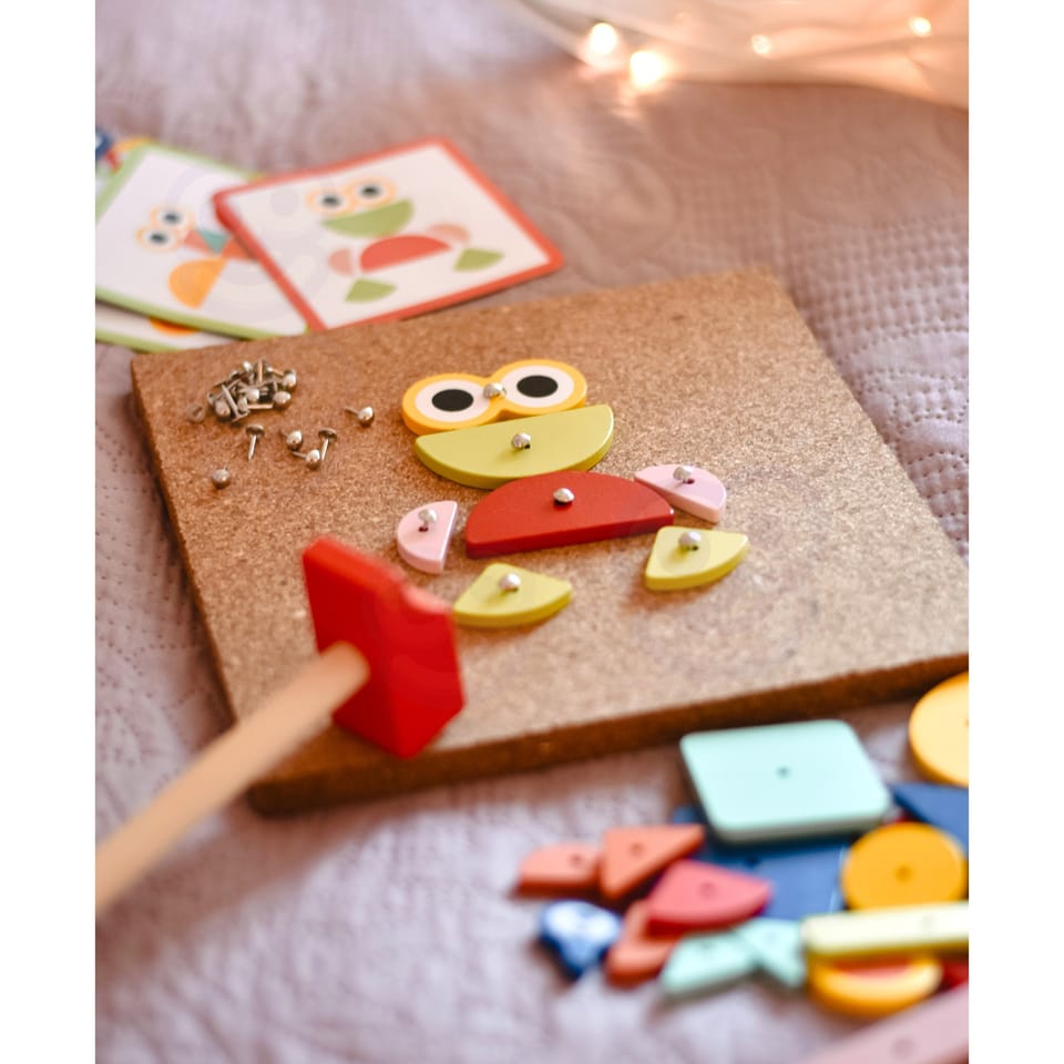 - - zestaw zawiera 82 el.: 30 klocków, 40 pinezki, 10 kart z 20 wzorami, tablice korkową oraz młotek