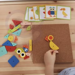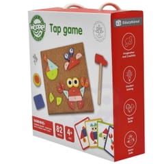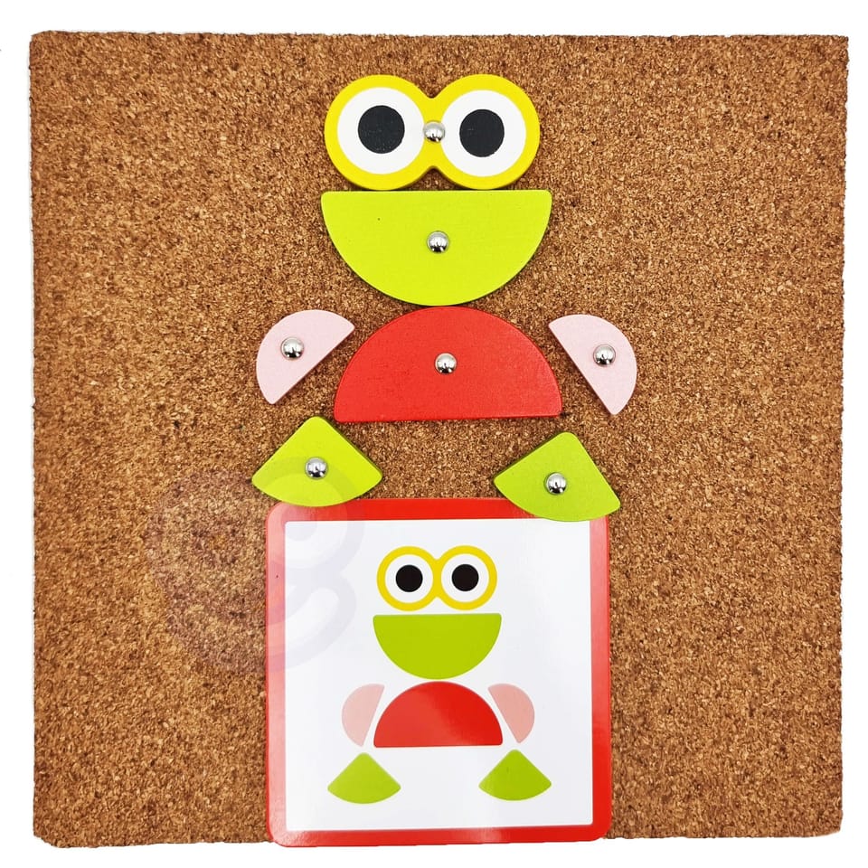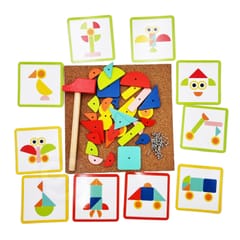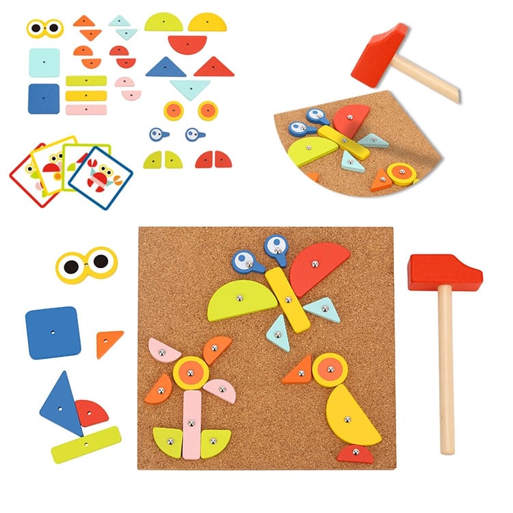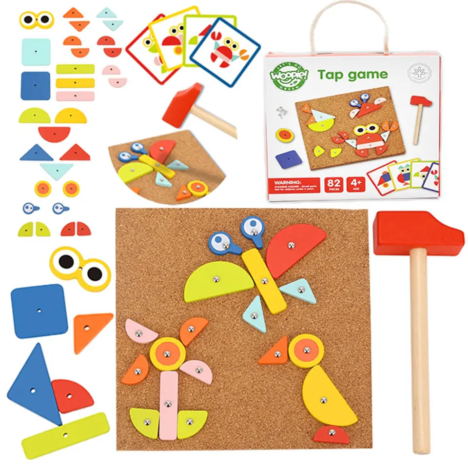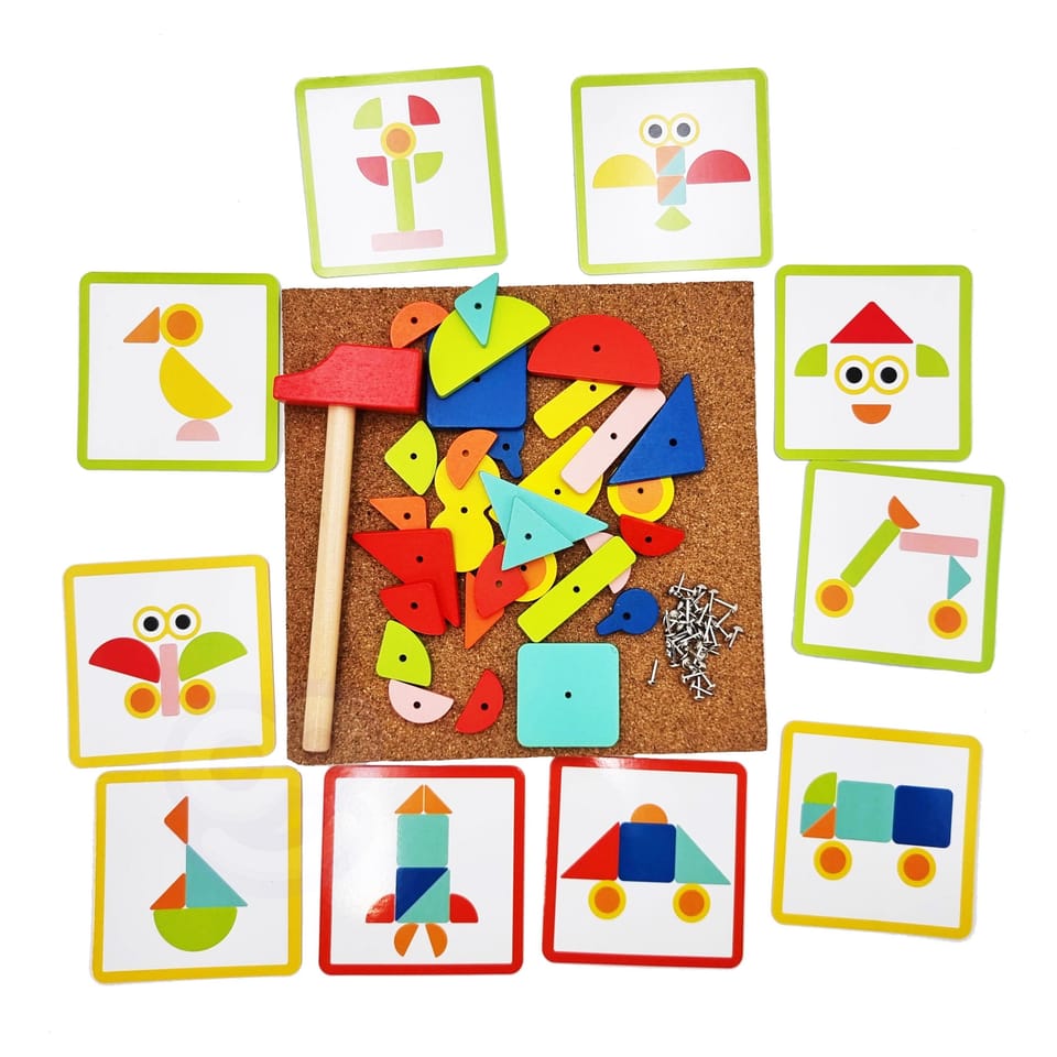 - - zestaw zawiera 82 el.: 30 klocków, 40 pinezki, 10 kart z 20 wzorami, tablice korkową oraz młotek