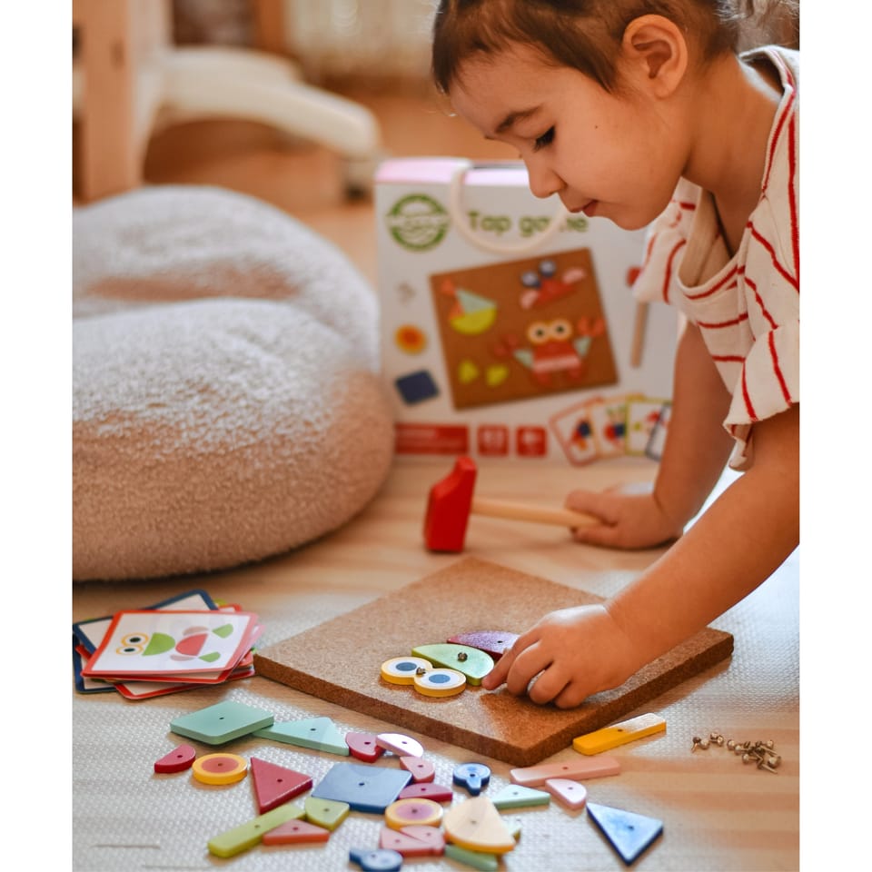 Przybijanka korkowa od marki WOOPIE z serii GREEN to idealna zabawka edukacyjna dla małego konstruktora. Dzieci mogą odtwarzać wzory z kart lub tworzyć własne układy z kolorowych, drewnianych elementów. Za pomocą młoteczka i pinezek przybijają klocki do korkowej tablicy, tworząc obrazki zwierząt, roślin czy pojazdów. Trzy poziomy trudności pozwalają dostosować zabawę do wieku i umiejętności dziecka. To wspaniała forma nauki przez zabawę – rozwija motorykę, kreatywność i logiczne myślenie!