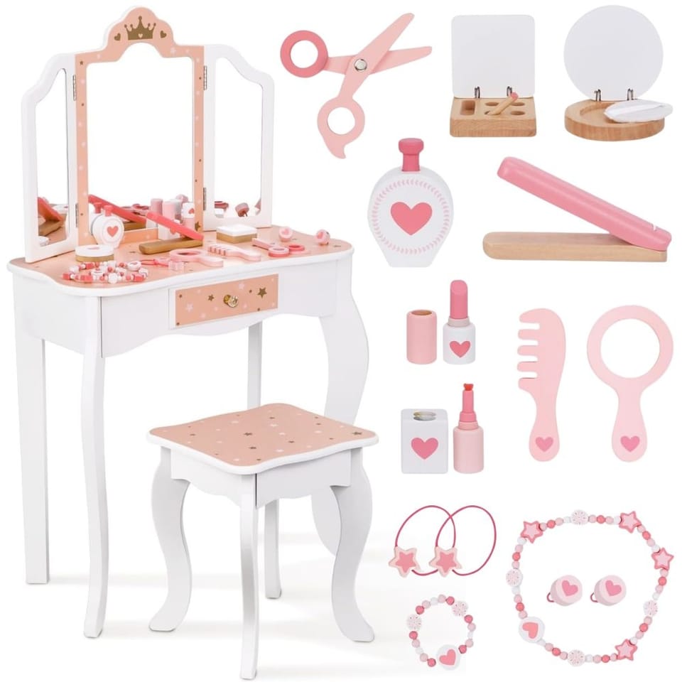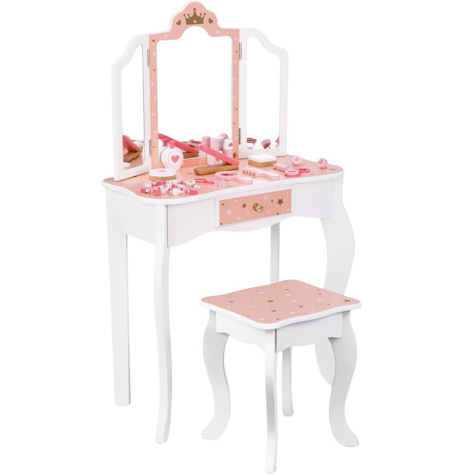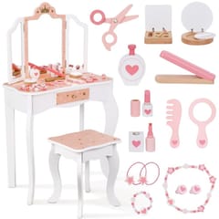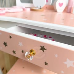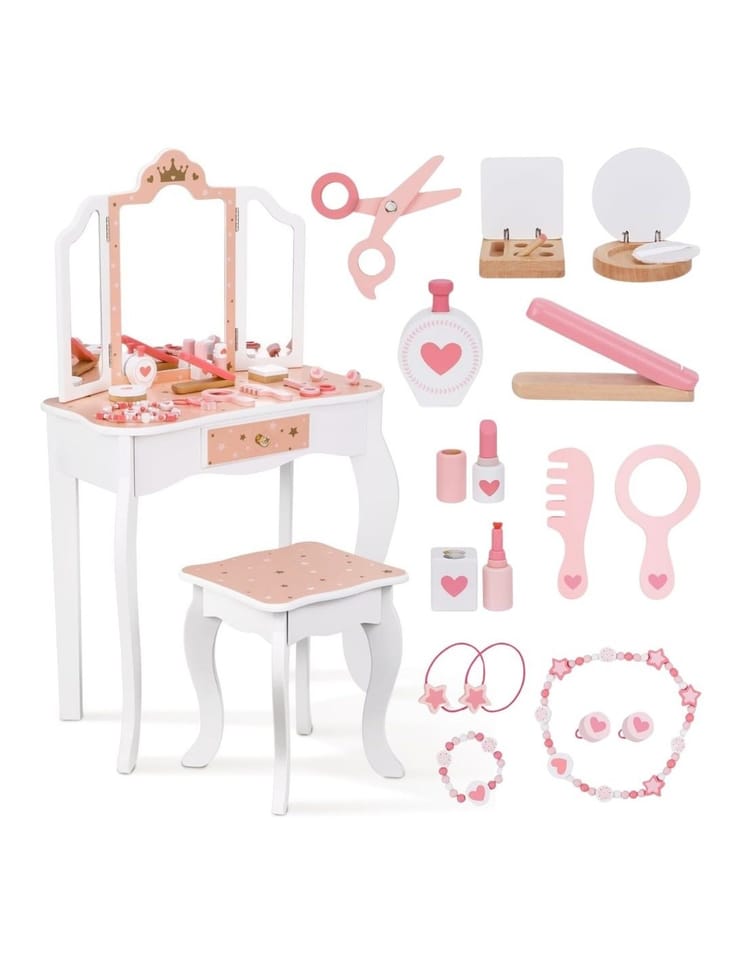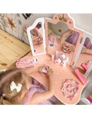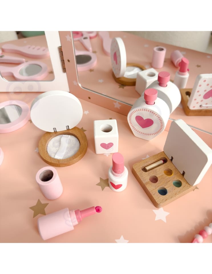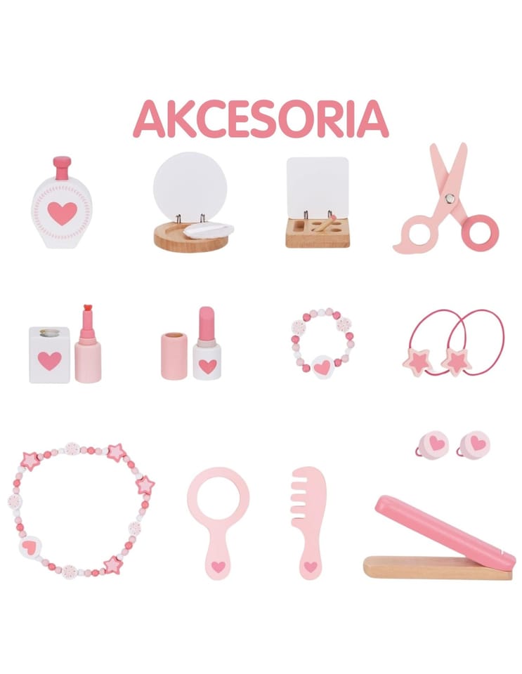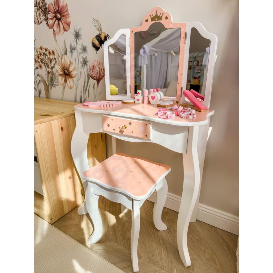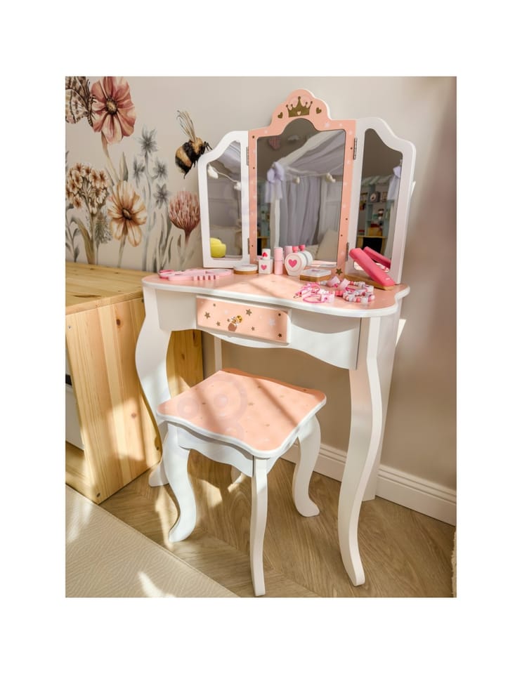 Drewniana toaletka z akcesoriami dla dzieci od Woopie Green to niezwykle urocza i dopracowana w każdym szczególe zabawka, która przenosi dzieci w świat wyobraźni, piękna i kreatywnej zabawy. Zaprojektowana z myślą o najmłodszych miłośniczkach stylu i estetyki, stanowi nie tylko piękny mebel do pokoju, ale również narzędzie wspierające rozwój emocjonalny, społeczny i manualny dziecka. Toaletka zachwyca eleganckim designem inspirowanym klasycznymi meblami dorosłych – ma kształt delikatnego biureczka z potrójnym lustrem, szufladką na drobiazgi i wygodnym stołeczkiem dopasowanym do wzrostu dziecka. Całość wykonana jest z wysokiej jakości drewna, pomalowanego bezpiecznymi, nietoksycznymi farbami w pastelowych odcieniach różu, bieli i złota. Każdy element został starannie oszlifowany, aby zapewnić bezpieczeństwo podczas zabawy. Zdobienia w postaci korony, serduszek i gwiazdek nadają toaletce bajkowego charakteru, sprawiając, że dziecko może poczuć się jak prawdziwa księżniczka lub artystka przygotowująca się do występu. Jej stylowy wygląd doskonale komponuje się z wystrojem dziecięcego pokoju – stanowi zarówno zabawkę, jak i elegancki element dekoracyjny. Toaletka wyposażona jest w praktyczną szufladkę, w której dziecko może przechowywać swoje skarby, biżuterię, akcesoria do włosów i kosmetyki do zabawy. Trzyczęściowe lustro z ruchomymi skrzydłami umożliwia przeglądanie się z różnych stron, a szeroki blat zapewnia dużo miejsca na wszystkie niezbędne dodatki. W zestawie znajduje się również bogaty komplet akcesoriów, dzięki którym zabawa staje się jeszcze bardziej realistyczna – wśród nich lusterko, grzebień, suszarka, cienie, lakier, pomadka, puder czy nawet drewniane perfumy. Dziecko może tworzyć własne stylizacje, ucząc się przy tym dokładności, cierpliwości i samodzielności.