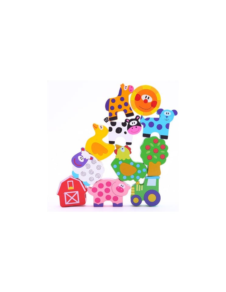- - 12 drewnianych klocków z dziurkami, przedstawiających m.in.: